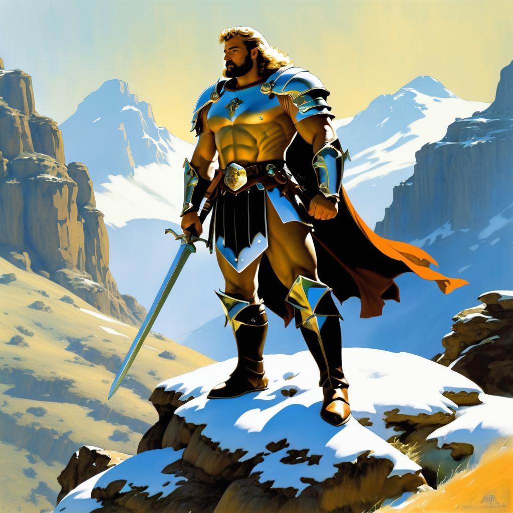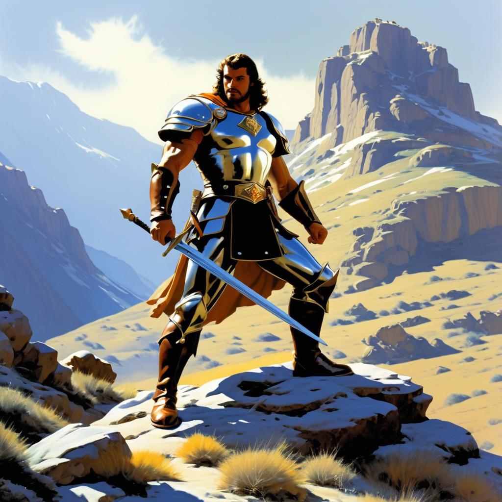 Heroic knight in the mountains, full body shot with detailed focus. Styled as digital illustration by Frank Frazetta, Julie Bell.