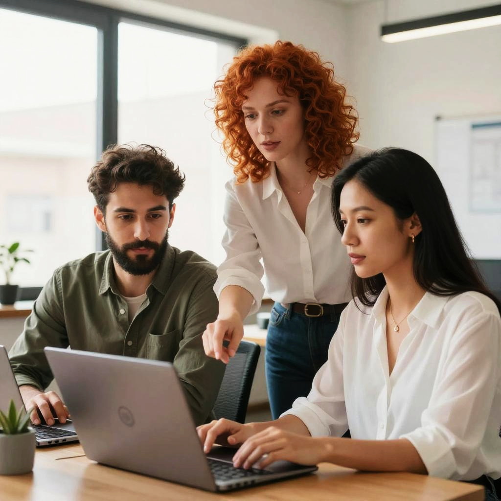 Photograph of three diverse professionals in a modern office. A bearded man with short dark hair in a green shirt sits left, looking at a laptop. A woman with curly red hair and a white blouse stands behind him, pointing at the screen. A woman with long black hair and a white blouse sits right, focused on the laptop. Bright natural light filters through large windows in the background, creating a professional and collaborative atmosphere.