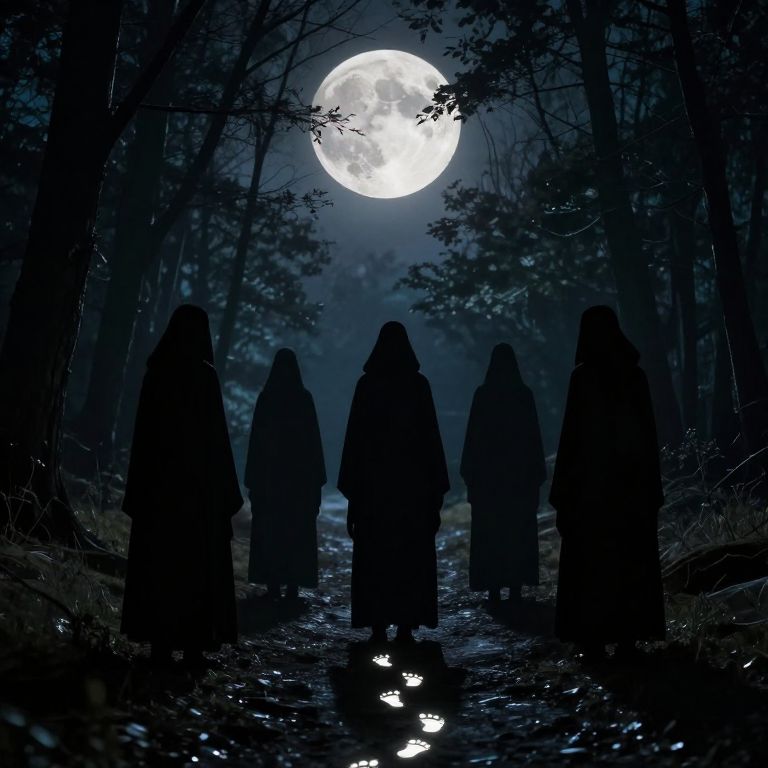Silhouetted hooded figures walk down a dark forest path under a bright full moon, creating a mysterious, eerie nighttime scene. Digital artwork.