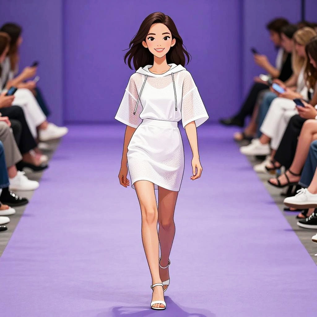 Woman with pretty face and pretty hair. smiling Woman, sporty chic, white mini dress with perforated fabric, straight cut, t-shirt neckline, short sleeves, see-through oversize hooded cape with drawstring, white heeled sandals, clean and minimalist style, runway background. --sref 1467