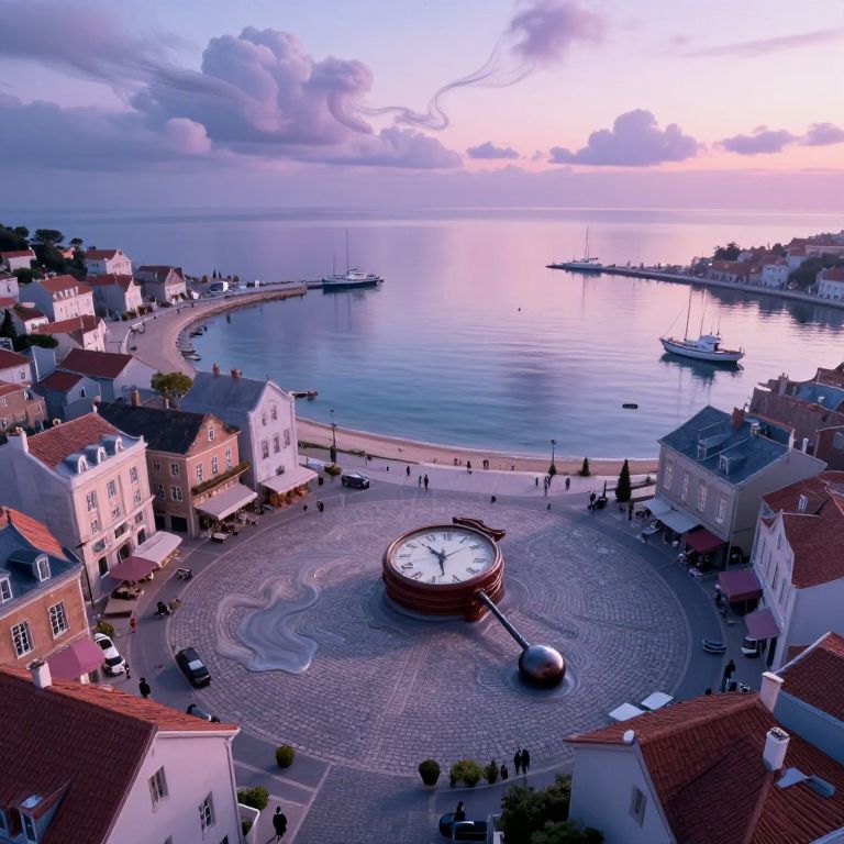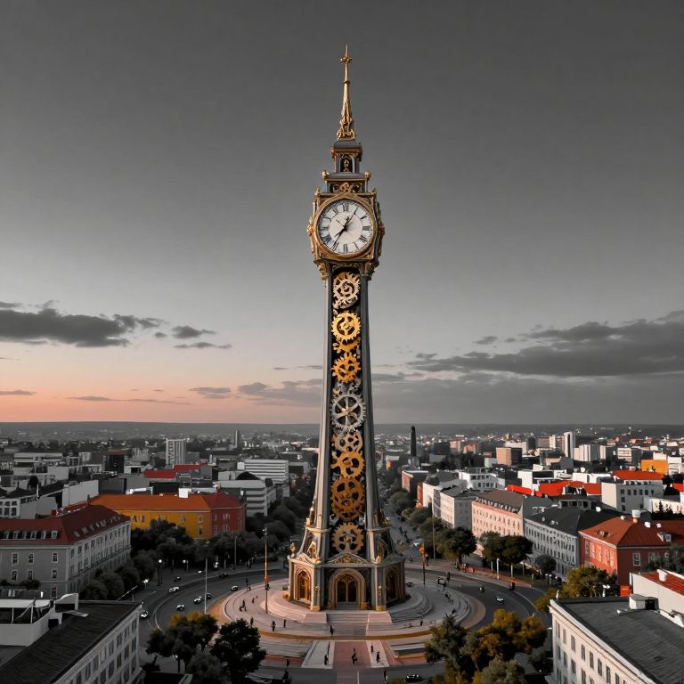 A digital artwork depicting an enigmatic clocktower with intricate, surreal architecture dominating over a foggy, quaint town at dawn. The tower's hands remain still in a moment frozen in time. From an insect's viewpoint, the details of the tower's mechanisms and gears are visible, blending seamlessly with the soft light filtering through the misty atmosphere. This piece evokes feelings of unease, curiosity, and awe, capturing the essence of dreamlike visions without directly referencing specific artists or the phrase \"melting clocks.\