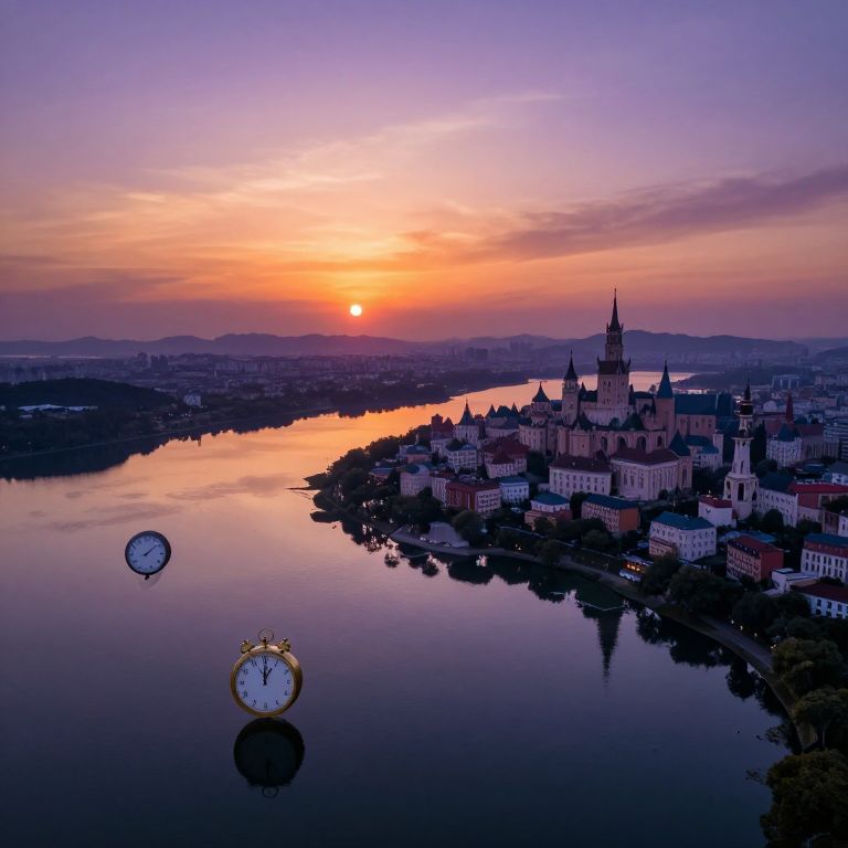 Photograph of a Victorian-style clock tower with large, black, Roman numeral clock face and intricate, dark metal gears visible on its sides. The clock shows the time as approximately 10:10. The tower stands prominently in the foreground, with a misty, early morning sky in the background. Below, a small town with white and red-roofed houses is visible, with trees and streets adding depth. The sunlight is soft, casting a warm glow on the clock's face. The overall scene evokes a nostalgic, serene atmosphere.