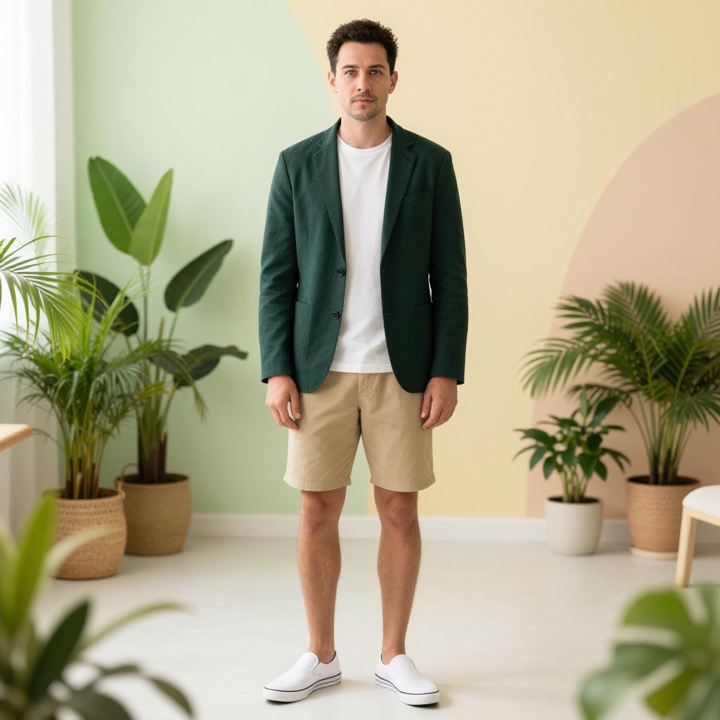 A man, dark green cotton blazer, white crew neck tee, khaki shorts, white canvas slip-ons, sunlit therapy rooms, calming pastel walls, lush indoor plants, camera obscura style, relaxed expression, fresh and summery appearance. Man has masculine face and piercing eyes