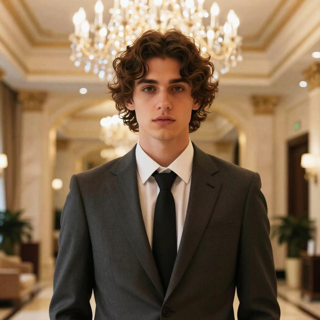 Wavy Blowout hairstyle on male model, wearing formal suit, in luxury hotel lobby, captured in fashion editorial style with chandelier sparkle.