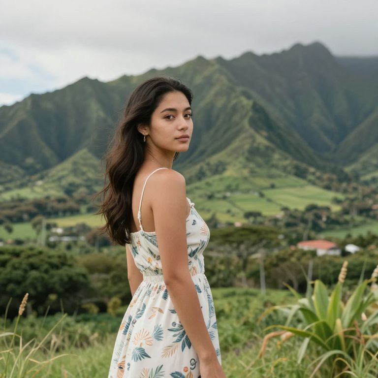 Photograph of a young woman with medium brown skin and long, wavy, dark brown hair standing in a lush, green landscape. She wears a white, sleeveless dress with a blue and green leafy pattern. The background features rolling, green hills under a cloudy sky, with scattered trees and a small red-roofed house visible in the distance. She looks over her shoulder with a neutral expression, and her dark eyes are slightly visible. The foreground includes tall grasses and a plant with spiky green leaves. The overall mood is serene and natural.