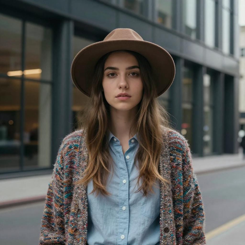 Photograph of a young woman with long, light brown hair, wearing a brown hat and a textured, multicolored cardigan over a light blue shirt. She stands in front of a modern, glass-filled urban building with dark columns and softly glowing windows in the background. Her expression is neutral, and the lighting gives a slightly moody, overcast feel to the scene.