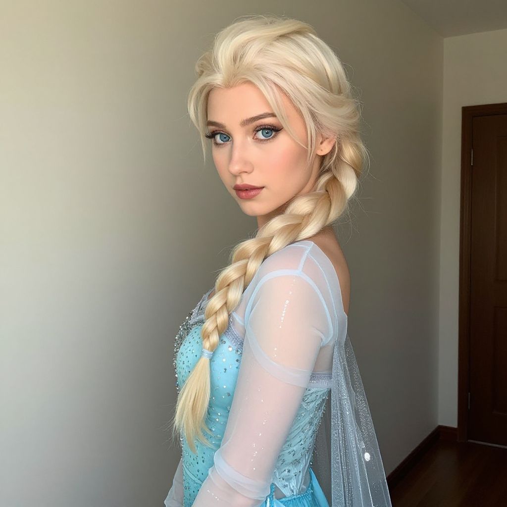 "elsa fancy dress costume, 1girl, solo, blonde hair, braid, single braid, dress, long hair, looking at viewer, blue eyes, hair over shoulder, see-through Realistic photo of casual sexy person with pretty face"