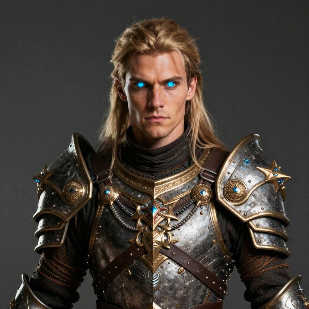 Photograph collage of a muscular, blond-haired man with long hair in shiny silver medieval armor and red scarf, serious expression, dark background.