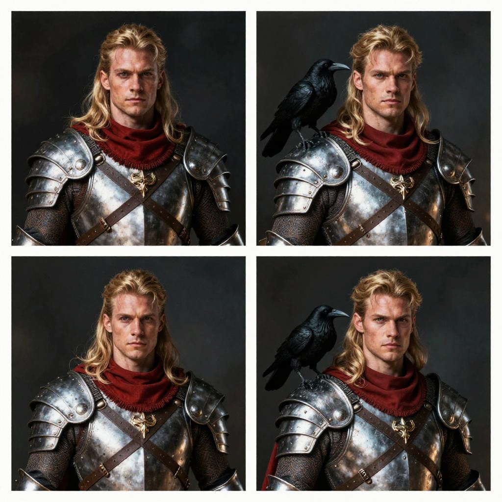 This is a digital collage of four images featuring a muscular, blonde, white male character with long hair, wearing medieval-style, silver armor and a red scarf. He has a serious expression and is accompanied by a raven on his shoulder. The background is dark and moody, with subtle light effects and shadowy textures. The character's intense gaze and warrior attire give off a strong, epic vibe.