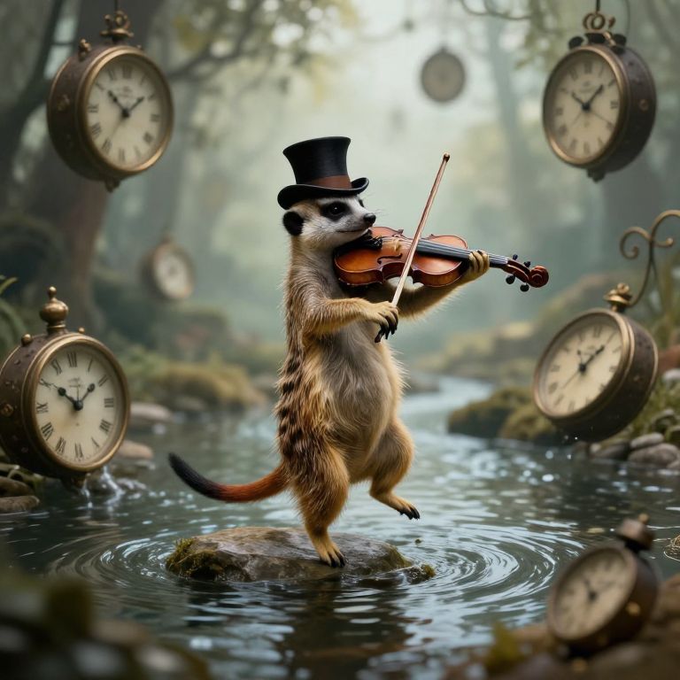 In a dreamlike realm where time flows backward, a meerkat adorned in a top hat serenades a river of floating clocks with a violin crafted from shadows, weaving a melody of nostalgia and the eternal dance between memory and loss.