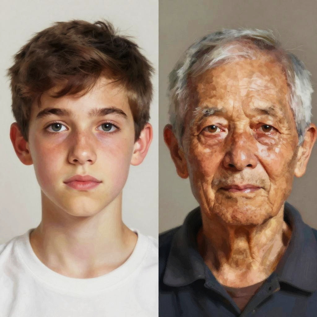 Dual portrait with an age filter effect, split screen of a teenager and an elderly person, expressive eyes, realistic skin textures, soft focus background, impressionistic style with modern digital painting techniques, warm and cool color contrasts highlighting life passage.