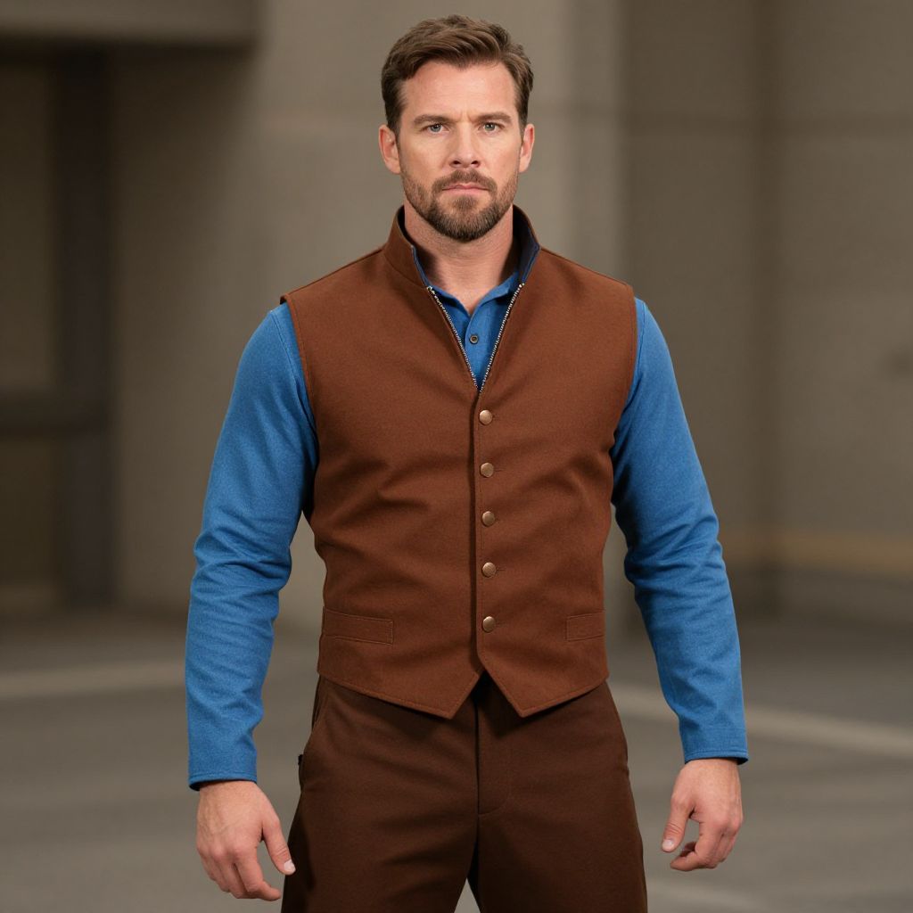 Warriors Vest Costume, man in a brown vest and a blue shirt