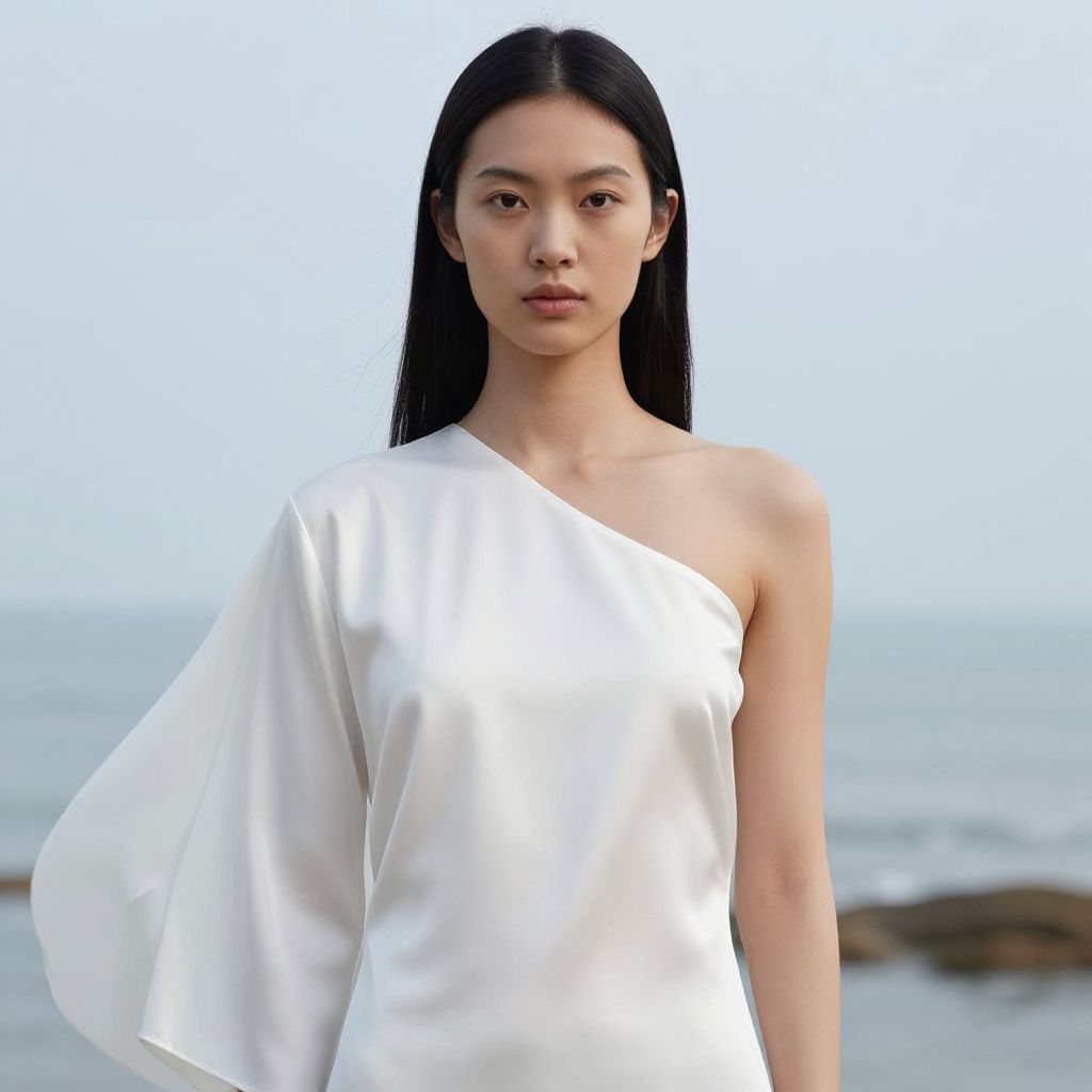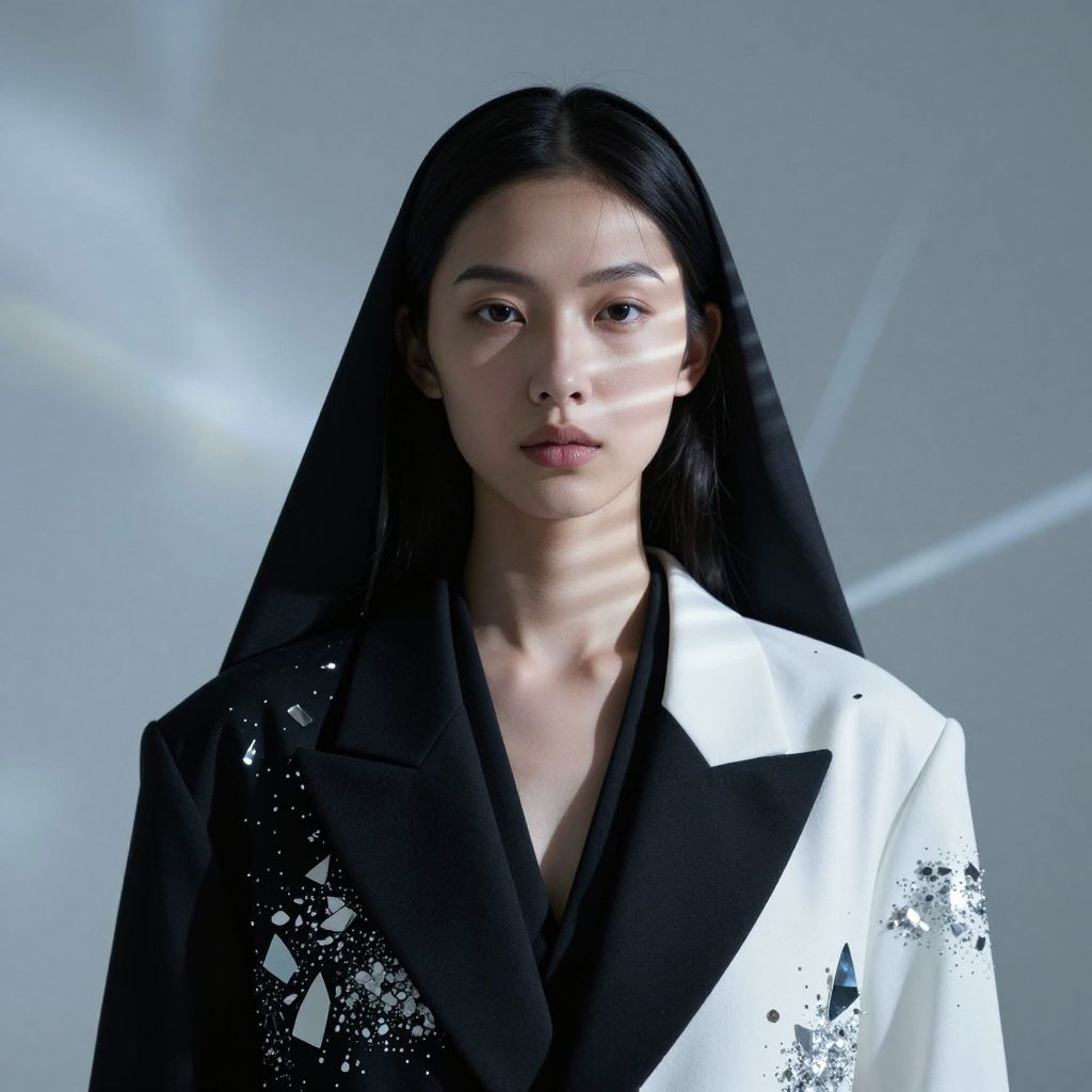 Photograph of an East Asian woman with long, straight black hair, wearing a black and white blazer with splattered black paint patterns. She has a neutral expression and light skin. The background is a gradient of light gray with a subtle, white light beam on the left. The lighting highlights her face and shoulders, creating a soft, shadowed effect. The image has a modern, minimalist fashion aesthetic.