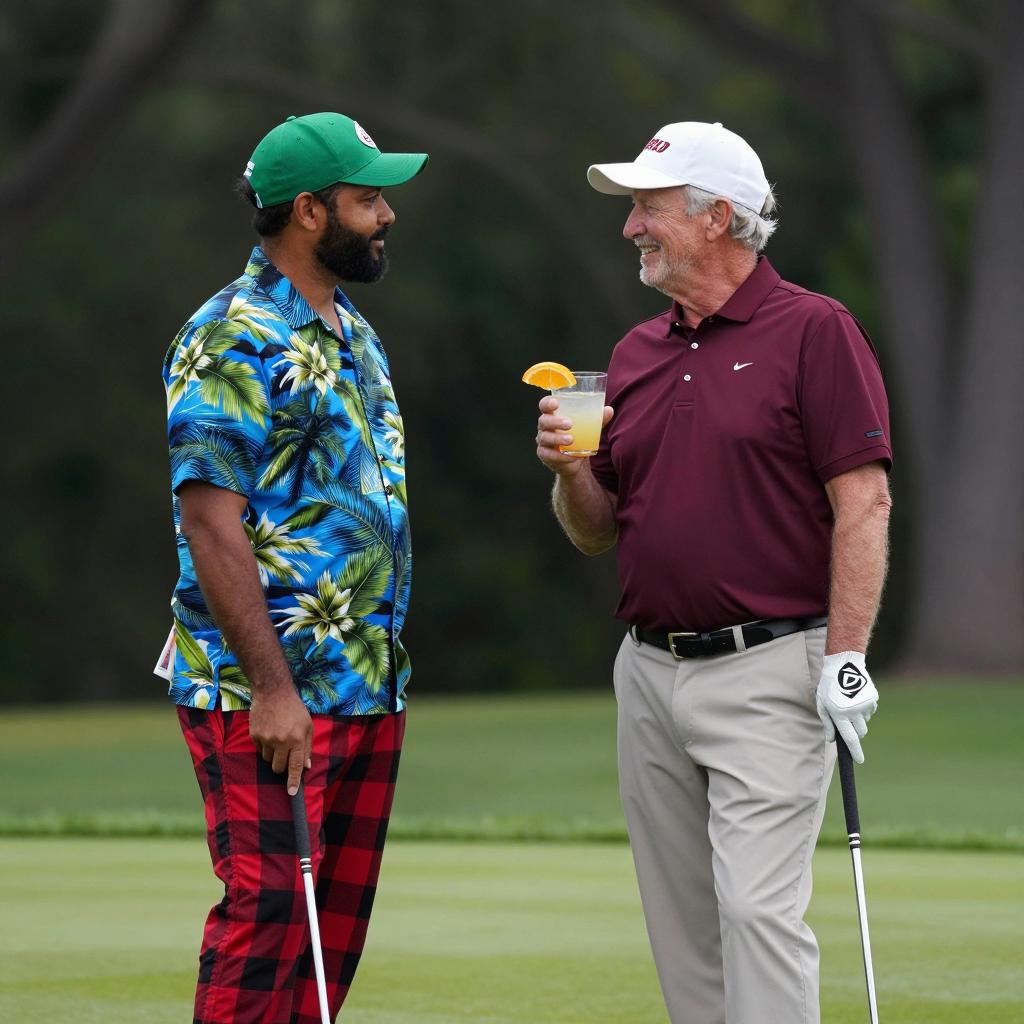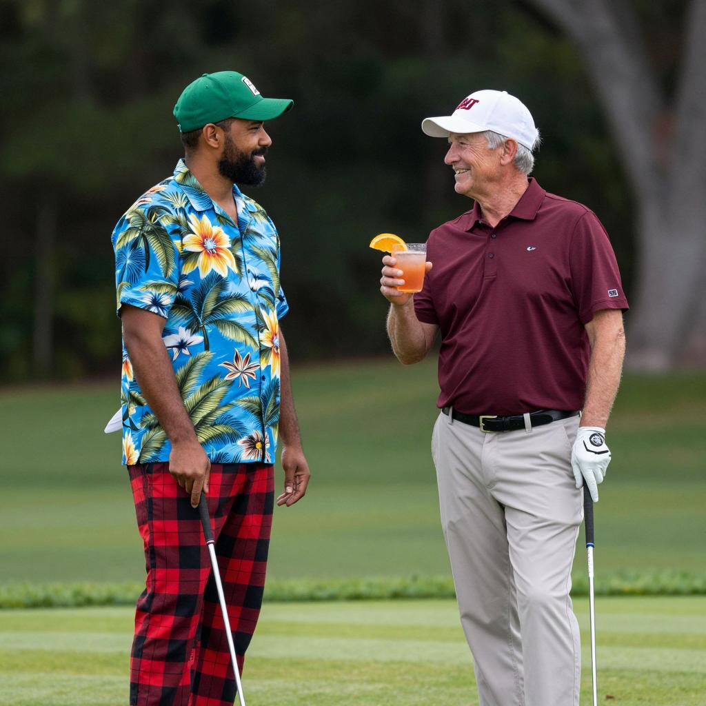 Photograph of two men standing on a golf course, facing each other and holding golf clubs. The man on the left has medium brown skin, a black beard, and is wearing a green cap, a colorful Hawaiian shirt with floral patterns, and red and black plaid pants. The man on the right has light skin, gray hair, wearing a white cap and maroon polo shirt, holding a drink garnished with an orange slice, smiling. Dark trees are visible in the blurred background.