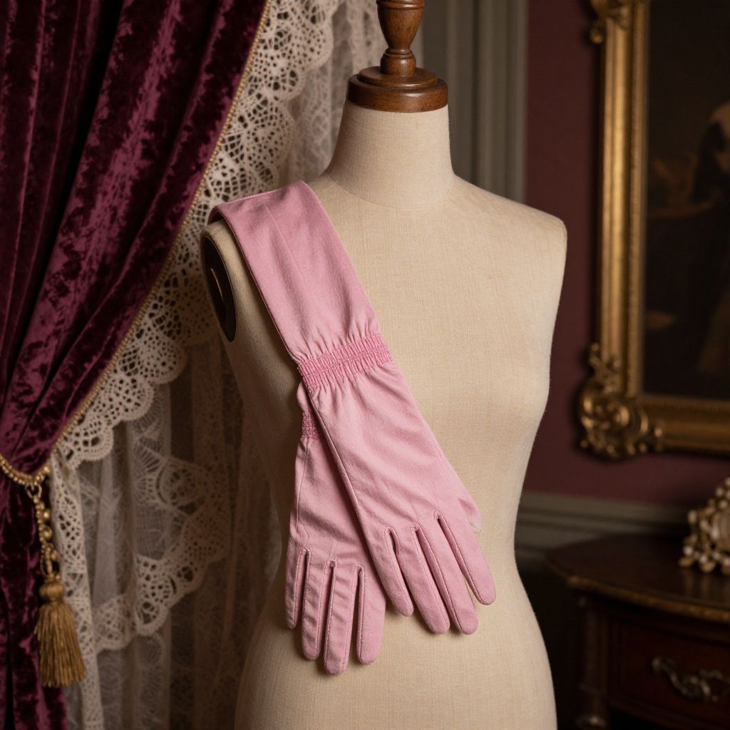 Pink opera gloves elegantly draped on a vintage mannequin in a dimly lit Victorian parlor, surrounded by antique lace and velvet curtains, emphasizing soft textures and a romantic atmosphere, soft warm lighting, cinematic style.