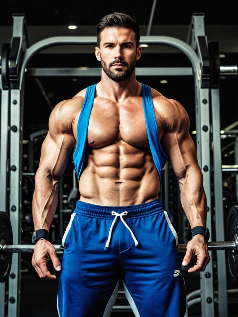 A muscular man with defined abs and pectorals stands confidently in a gym. He is wearing blue gym pants with white details and a blue tank top that exposes his chest. He has facial hair and wrist supports, holding a barbell behind him. The background shows gym equipment in a fitness center setting.
