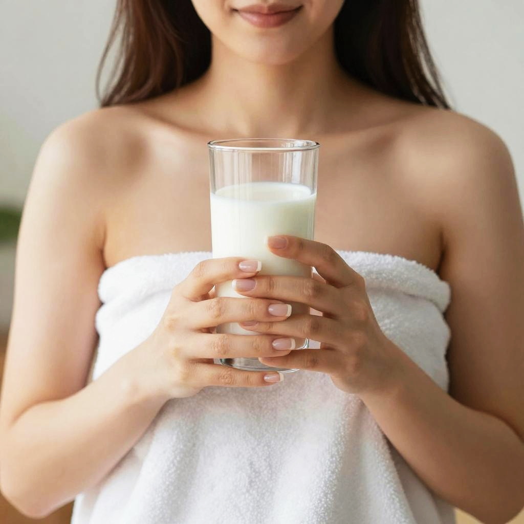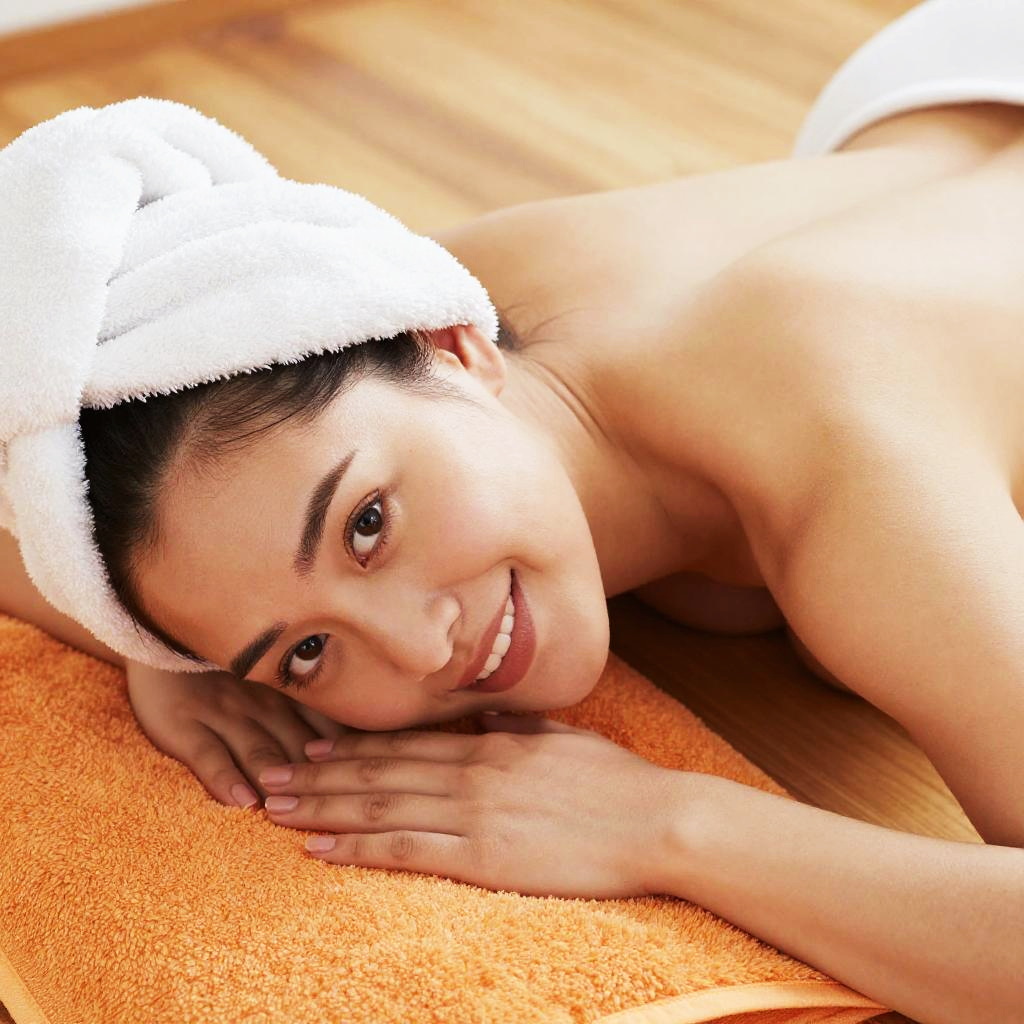 Photograph of a young woman with wet, dark brown hair taking a shower. She's holding an orange loofah sponge, covered in white soap bubbles, against her chest. Her eyes are closed, and she has a slight smile on her face. The background is a plain, white tiled shower wall. The image has a slightly overexposed, vibrant look.