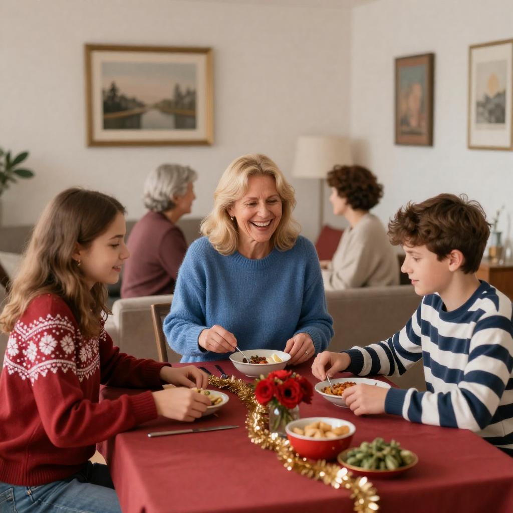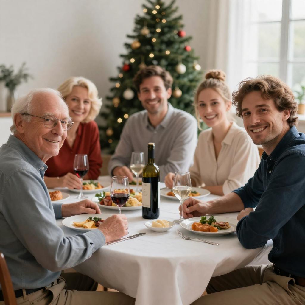 Photograph of six people around a dining table in a warmly lit, festive room. Five are wearing red Christmas sweaters, one in a blue vest. They are laughing and eating, with a colorful Christmas tree and fireplace in the background. Plates of food and drinks are on the table.