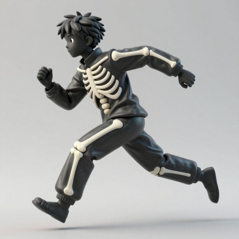 3D CGI image of a black, skeleton-themed, running boy with spiky hair, wearing a skeleton-print jacket and pants, against a white gradient