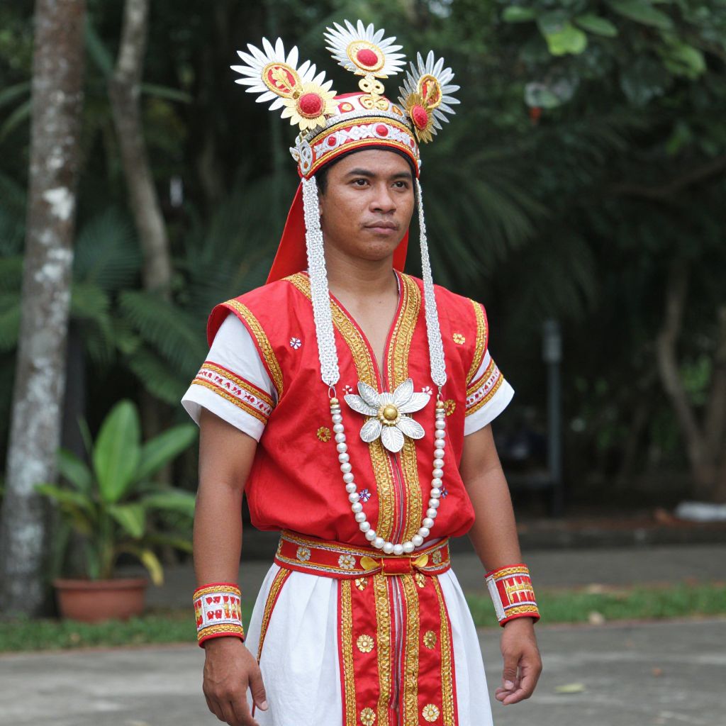 Philippines Tribal Costume, man in a red and white outfit and headdress
