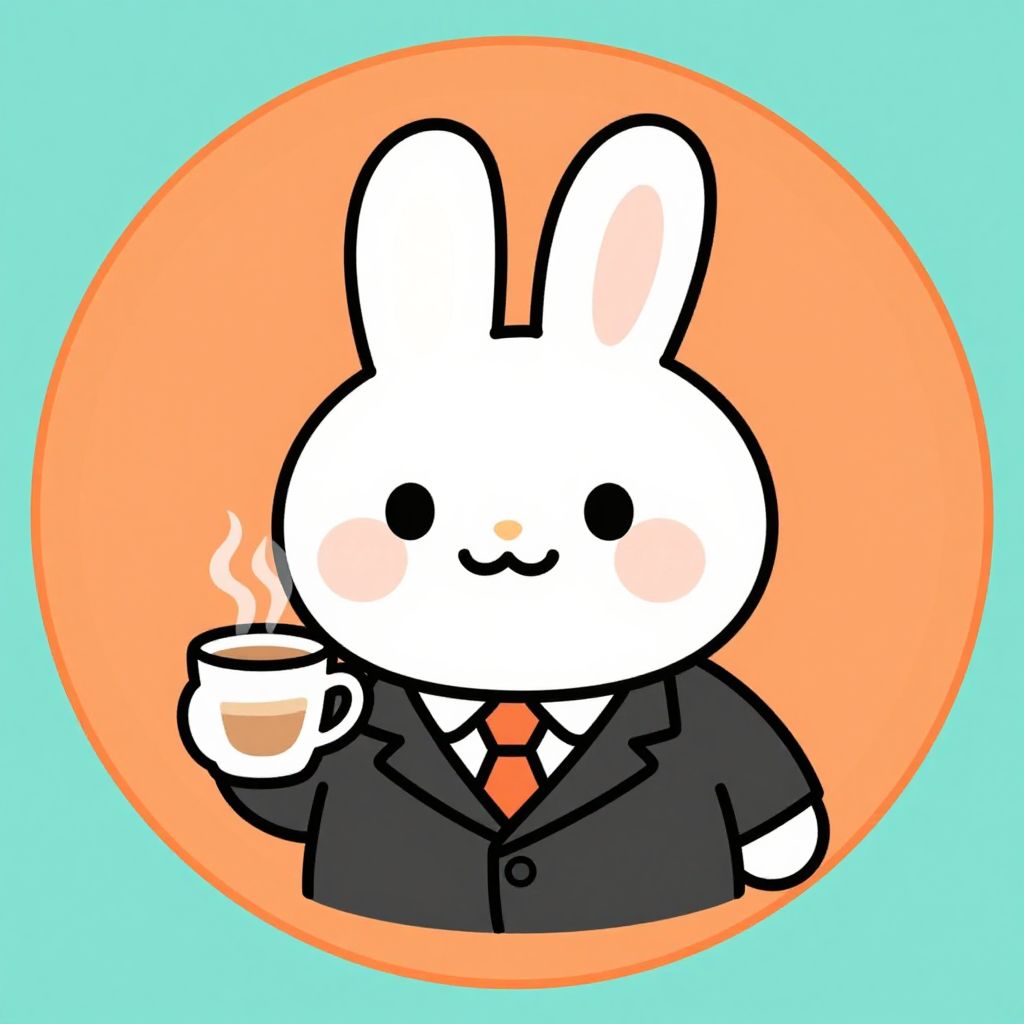 Cute digital cartoon of a white bunny in a black suit, holding a steaming cup, set against an orange circle on a blue background.