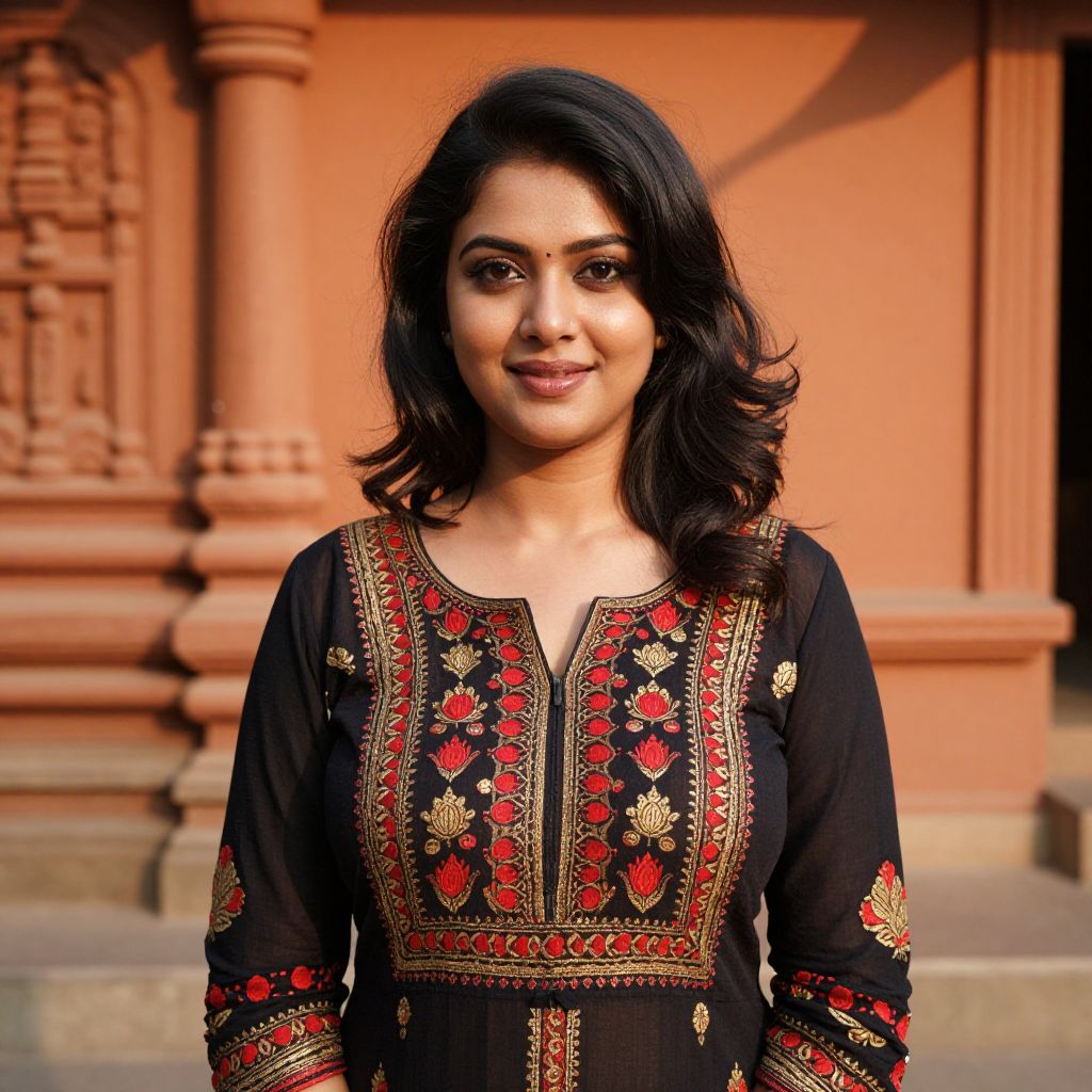 Photograph of a young South Asian woman with medium brown skin and black, shoulder-length wavy hair. She wears a black traditional long-sleeve kurta adorned with intricate red and gold embroidery along the chest, sleeves, and neckline. Her face is softly lit, with a gentle smile. The background features a warm, orange-colored stone building with detailed carvings and columns, suggesting an architectural style reminiscent of Indian or Pakistani heritage. The lighting enhances the rich colors of her outfit and the background, creating a warm, inviting atmosphere.
