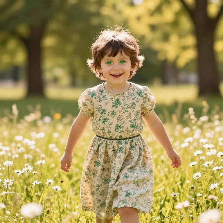 Photograph of a young girl with short brown hair and green eyes, smiling brightly. She wears a cream-colored dress with green floral patterns and a green ribbon at the waist. She is walking through a sunlit meadow filled with tall grass and white daisies. The background features blurred, tall trees with sunlight filtering through their leaves, creating a warm, golden glow. The girl's joyful expression and the serene, natural setting evoke a sense of innocence and happiness.