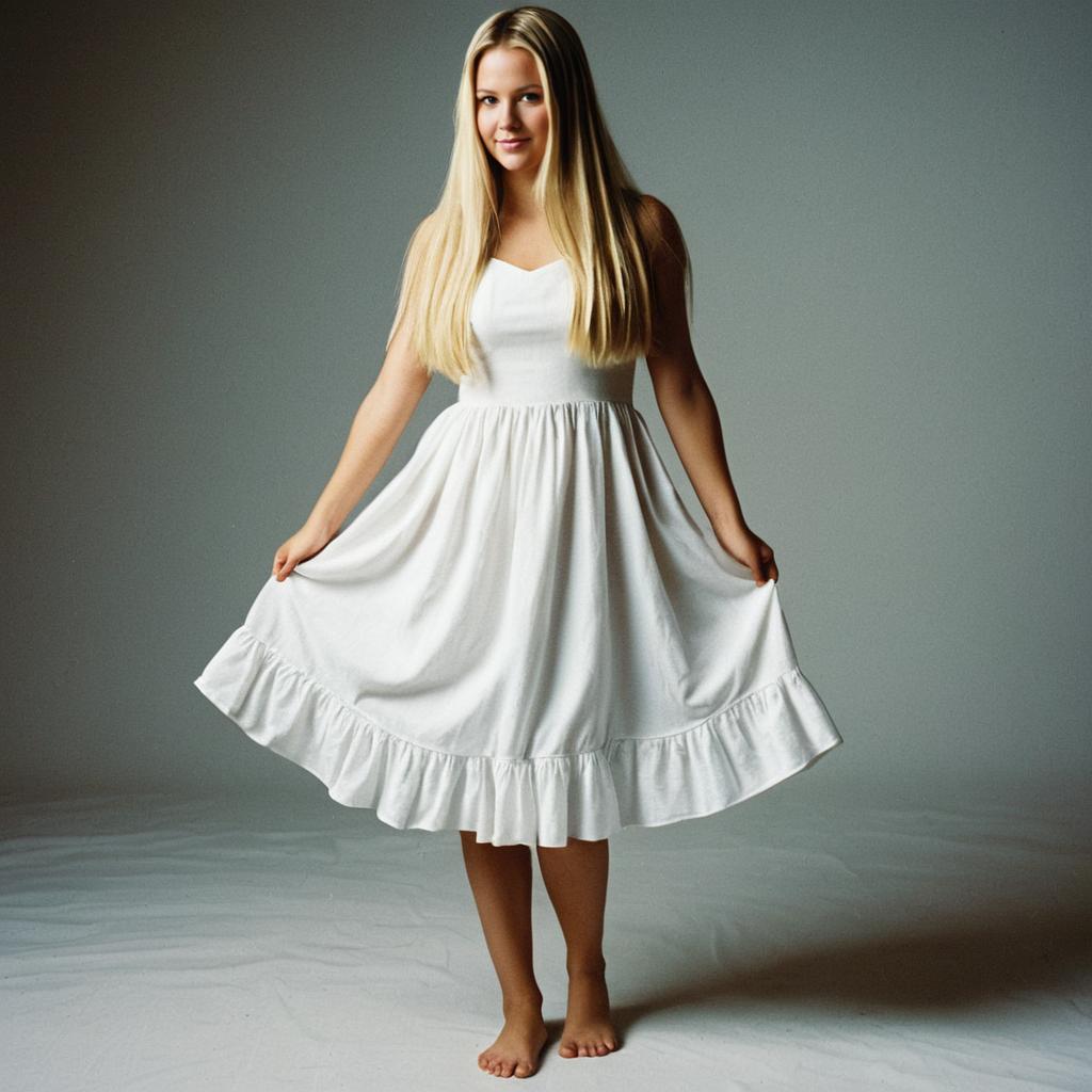 Funny character costume,1girl, solo, dress, long hair, white dress, blonde hair, realistic, standing, full body, brown hair, barefoot, photorealistic