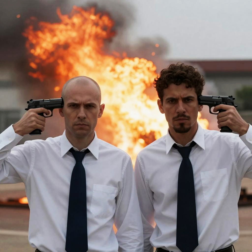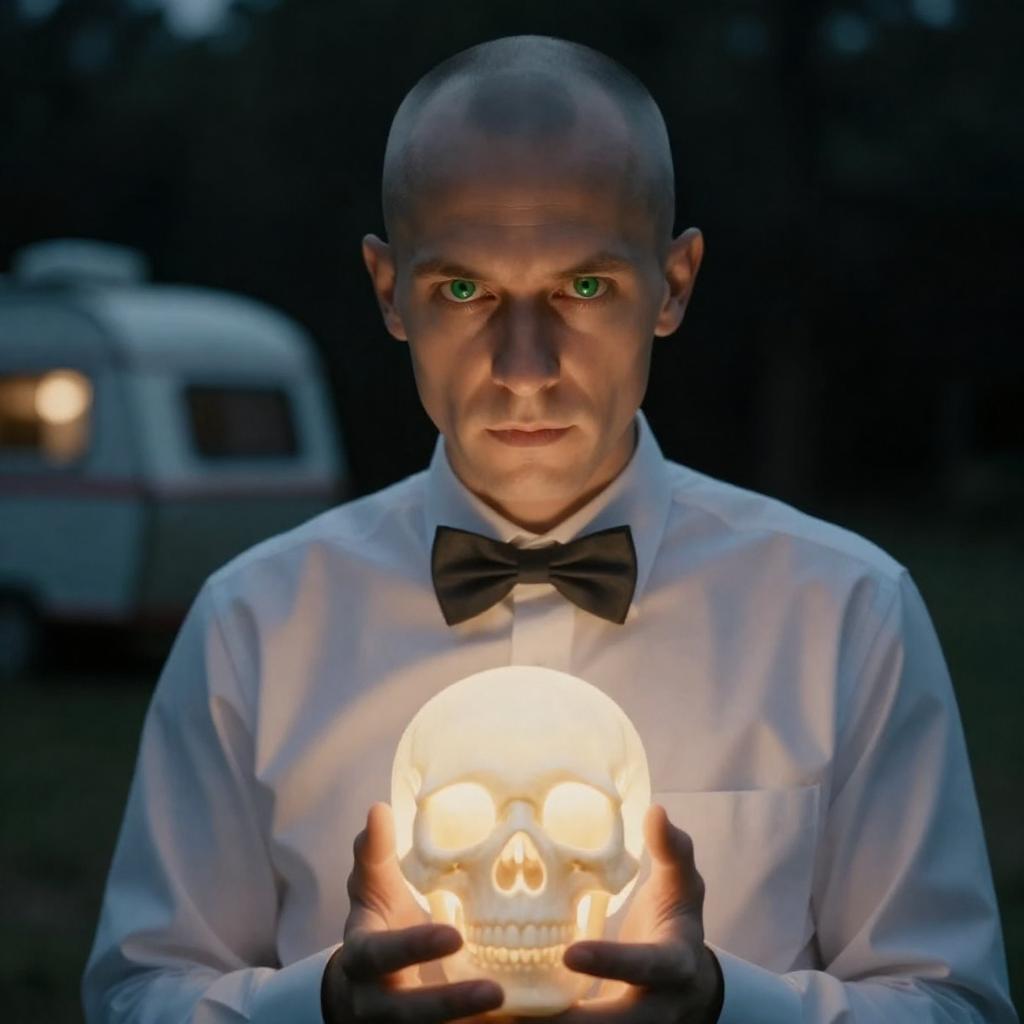 Photograph of a bald man with green eyes, white shirt, and bow tie, holding a glowing skull-like object. Dark background, a small blue trailer with windows is slightly illuminated on the left. Man's expression is focused and intense.