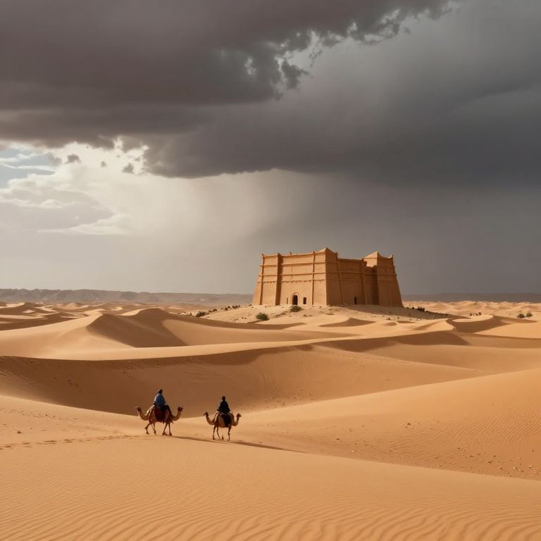 A desert caravan rides gently upon rolling dunes shaped by a sentient storm, which guides them toward a mirage that is, in fact, a real ancient citadel.