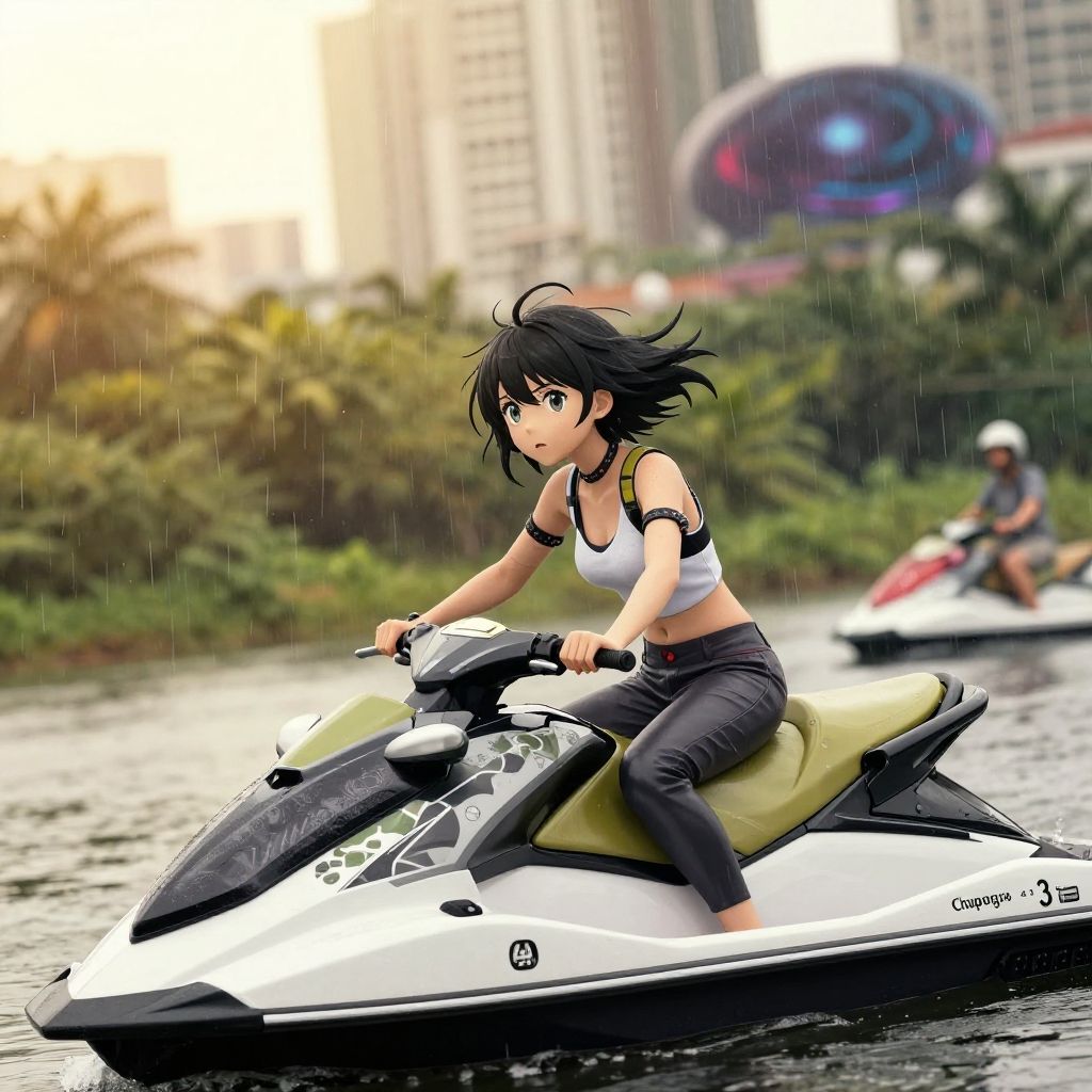 1girl, detailed Anime, award winning, shot from side of a ([Chupacabra:Jet ski:4]:1.3), the Chupacabra is very Boorish and Tedious, warm background, lush city and Quasar in background, Raining, tilt shift, Ultrarealistic, Light and Bright, Clockpunk, key light, telephoto lens, BW, Magic the gathering, Orton effect, photolab, hyperdetailed, (pop art designed by Patrick Nagel:1.2), (Andrea Arnold:1.1)