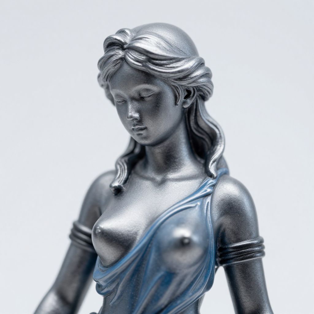 Photograph of a silver-toned, classical-style statue of a topless woman with wavy hair, draped in a blue cloth, against a white