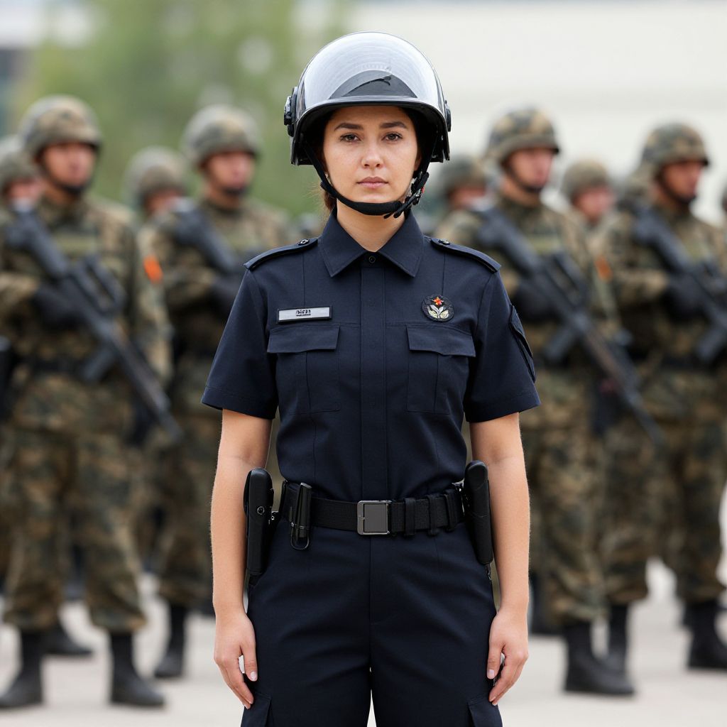Photograph of a young woman with fair skin and dark hair, wearing a black military-style helmet and olive green tactical uniform with a black strap across her chest. She has a gray, textured scarf wrapped around her neck. She stands in a blurred, busy urban environment with people in dark winter clothing in the background. Her uniform includes a belt with a pouch, and she has a focused expression. The background is out of focus, emphasizing her as the central figure. The image has a realistic, high-definition style.