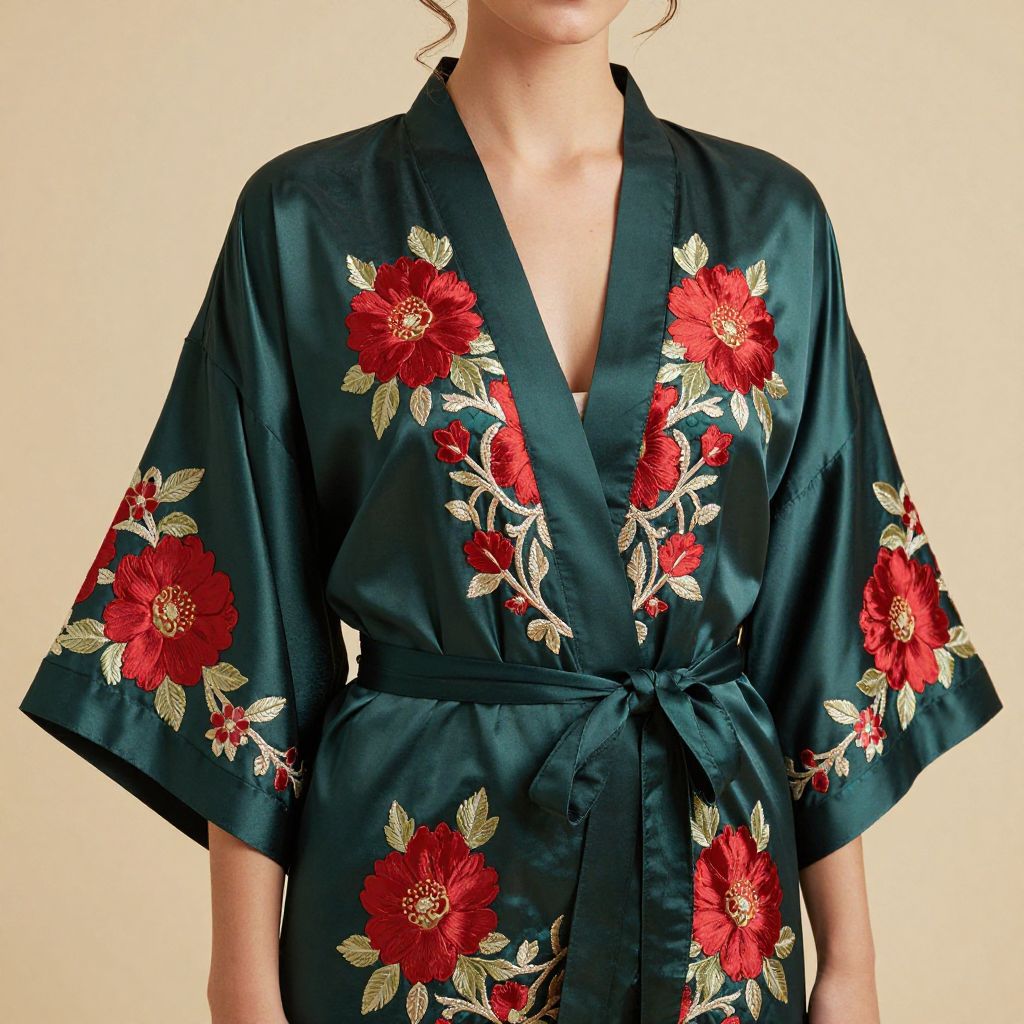 A woman elegantly showcases a silk satin floral robe featuring intricate embroidery in vibrant reds and greens, embodying bridal and bridesmaid chic with a high-definition, vintage-inspired aesthetic.