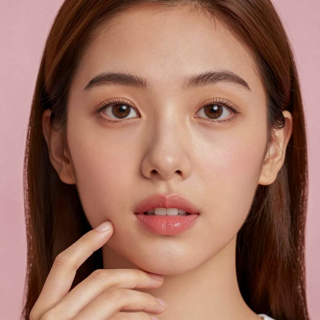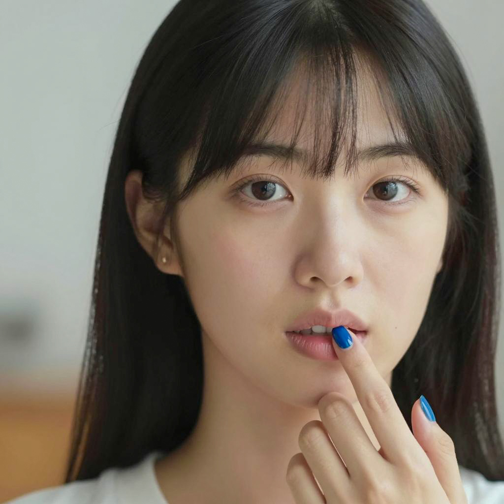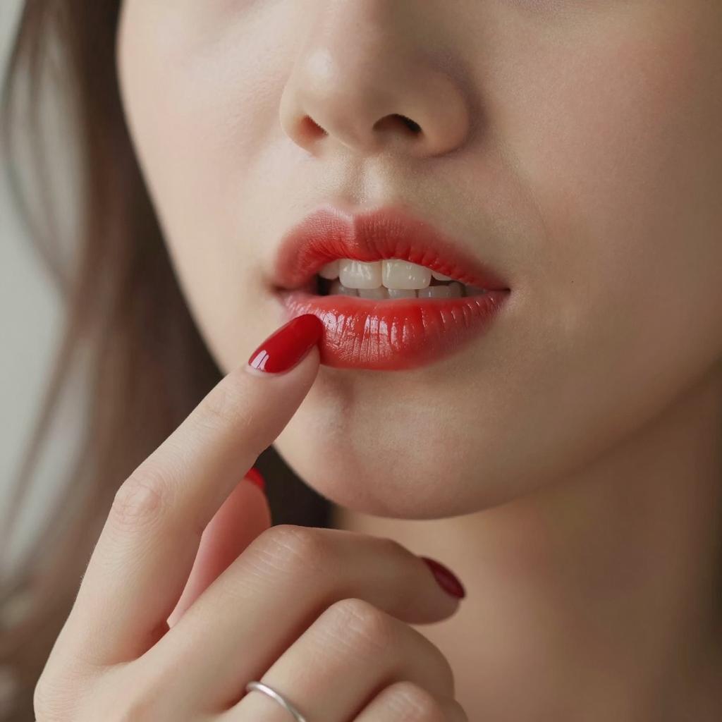 Close-up photograph of a woman's face, focusing on her mouth and hand. She has full, glossy red lips, slightly parted to reveal white teeth. Her right hand with red, pointed fingernails gently touches her lower lip. She wears a silver ring on her index finger. Her light brown hair is partially visible on the left. The background is blurred and neutral.