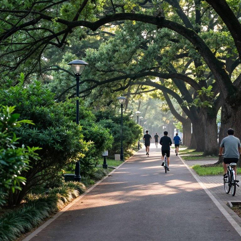 Bage green stylish urban park pathway surrounded by leafy bushes and old oak trees, early morning joggers and cyclists, subtle shadows cast by street lamps, inviting and tranquil city nature blend, photorealistic