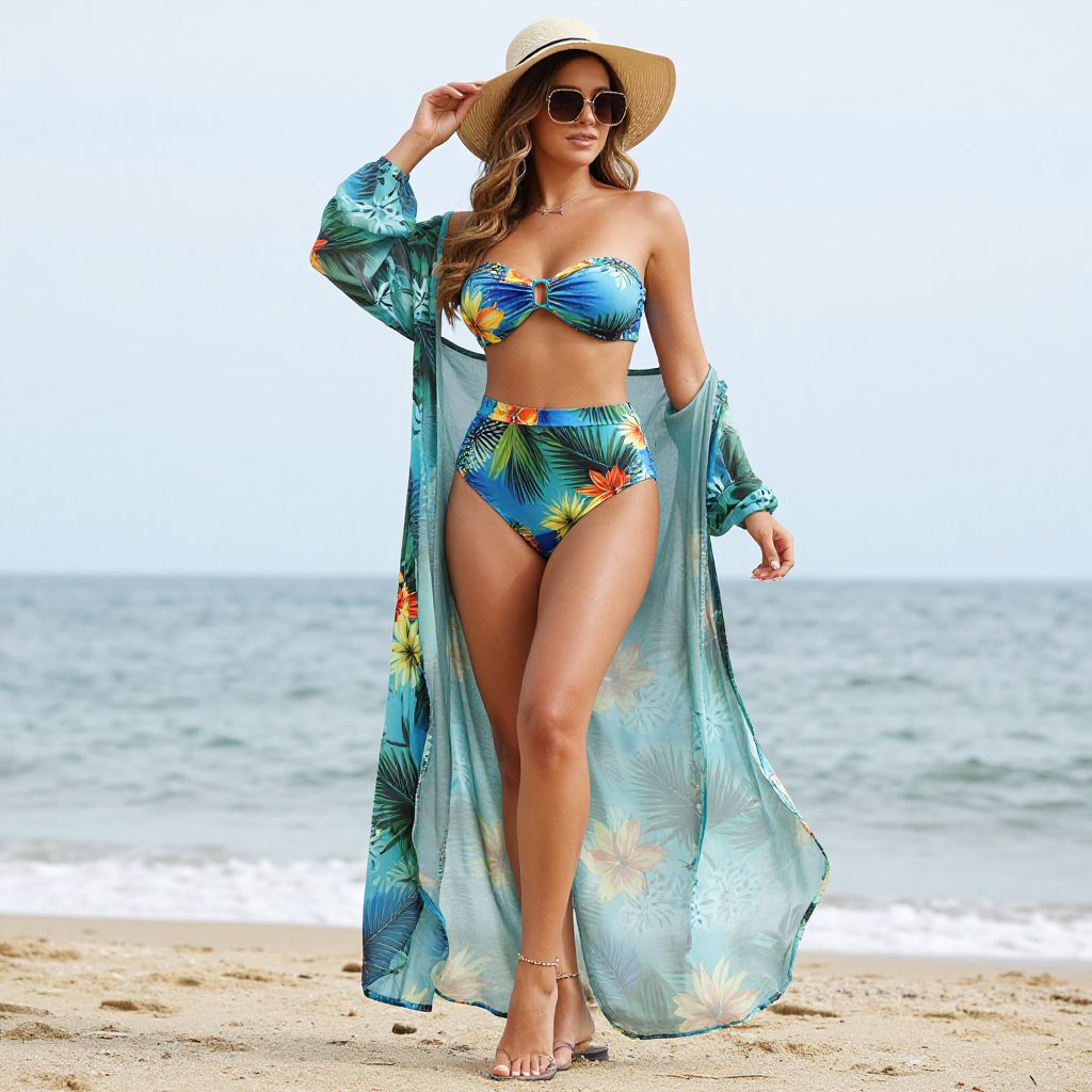 Full body shot, woman, bandeau bikini, vibrant tropical print, soft stretchy fabric, high-waisted bikini bottoms, matching tunic, lightweight sheer material, flowy silhouette, long sleeves, side slits, bohemian style, beach-ready, sun-kissed skin, accessorized with wide-brimmed hat, oversized sunglasses, delicate anklet, flip-flops, relaxed pose, ocean backdrop Sexy. Pretty face and beаutiful eyes. Big breasts