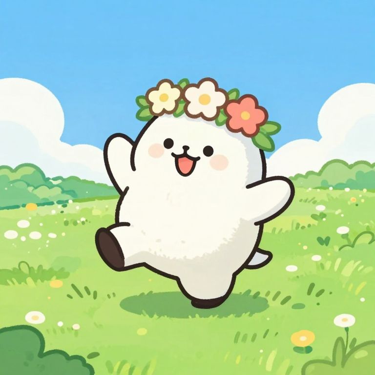 Jjangu, a cheerful rice cake mascot wearing a tiny flower crown, dancing in a lush green meadow under a clear blue sky, whimsical fantasy art style with bright colors and playful expressions