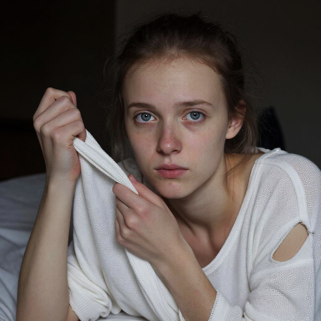 Photograph of a blonde woman in floral pajamas, covering her eyes with hands, mouth open in surprise, sitting on a bed in a dimly