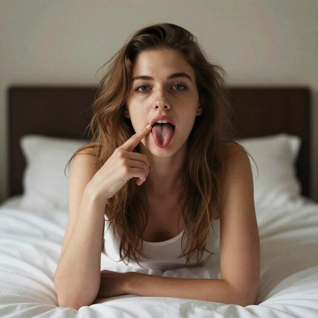 Photograph of a blonde woman with wavy hair, sitting on a bed in a dimly lit room. She is wearing a floral-patterned, low-cut pajama top and matching pants, revealing a hint of cleavage. Her eyes are wide open, and she has both hands covering her mouth, mid-laugh. The bed has white pillows and a beige blanket. The background features a dark wooden headboard, a nightstand with a lamp, and sheer curtains. The lighting emphasizes her expressive face and colorful pajamas, creating a playful and humorous atmosphere.