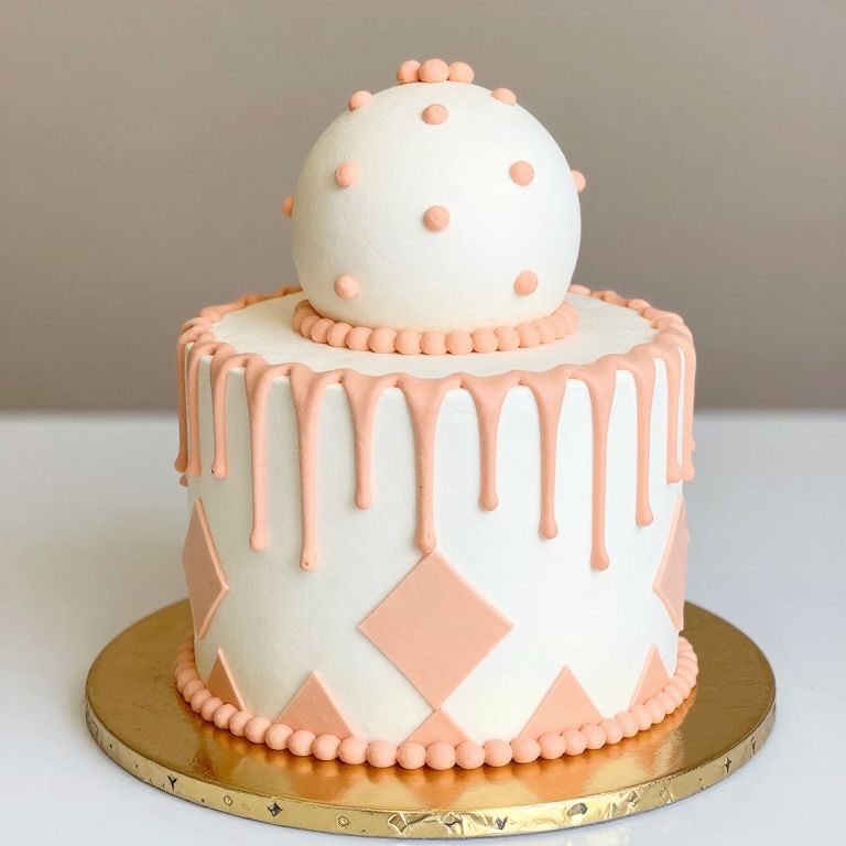 Moroccan-themed baby shower cake featuring a white base adorned with peach-colored geometric patterns, cascading drizzles, and a spherical dome decorated with small pink accents, all presented on a golden circular platter.
