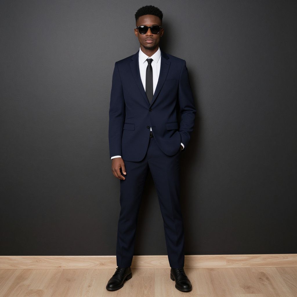 Photograph of a tall, dark-skinned man standing against a solid black background. He wears a sharp, dark navy blue suit with a white dress shirt and black tie. His right hand is in his suit pocket, and he has black, sleek, aviator-style sunglasses on. He has short, curly black hair and is wearing black leather dress shoes. The floor is light-colored wood, contrasting with the dark background. The overall style is modern and professional, with a focus on simplicity and elegance. The man's expression is neutral, and he stands confidently.