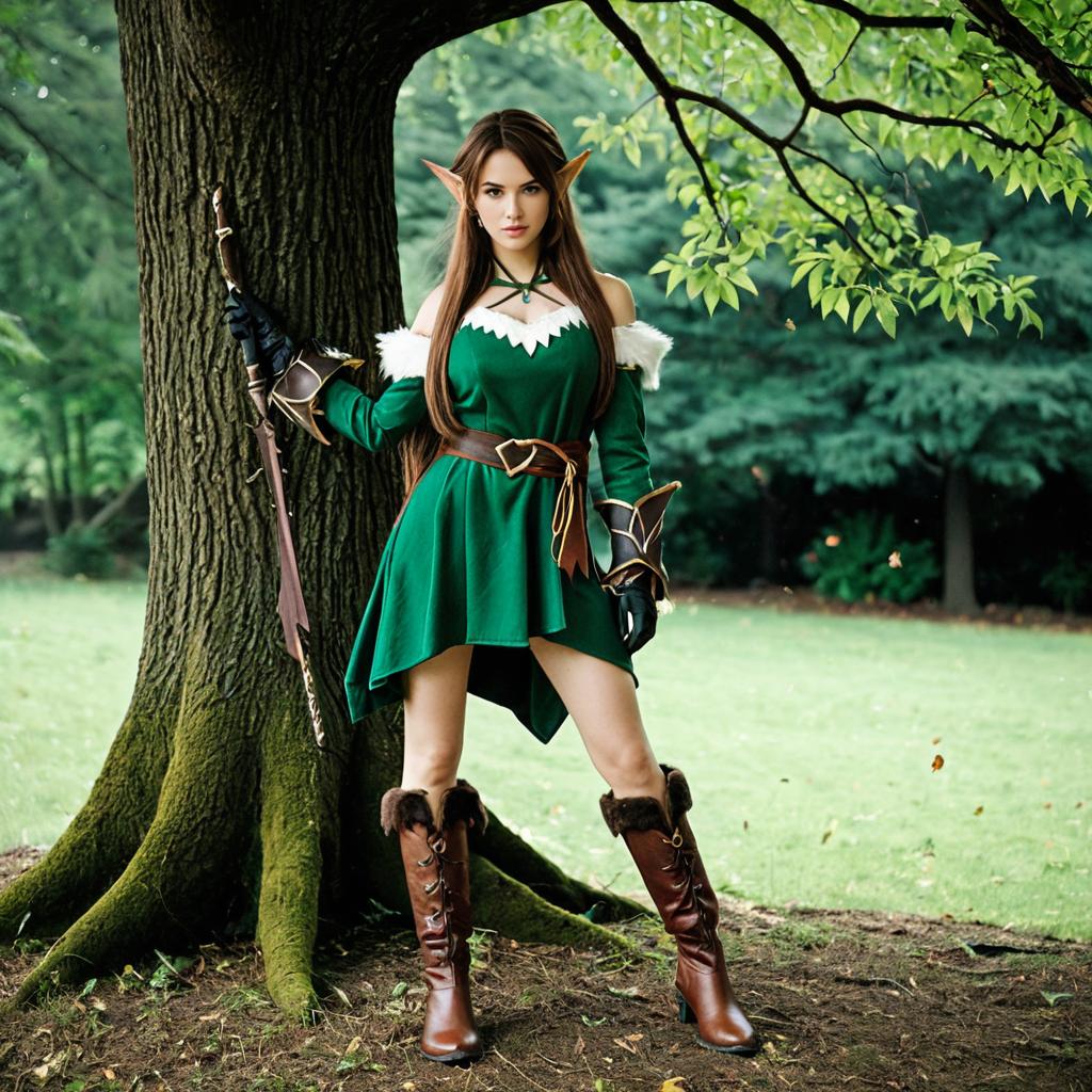 Jovi elf costume,1girl, pointy ears, solo, long hair, elf, dress, red hair, green dress, bare shoulders, belt, tree, outdoors, nature, forest, looking at viewer
