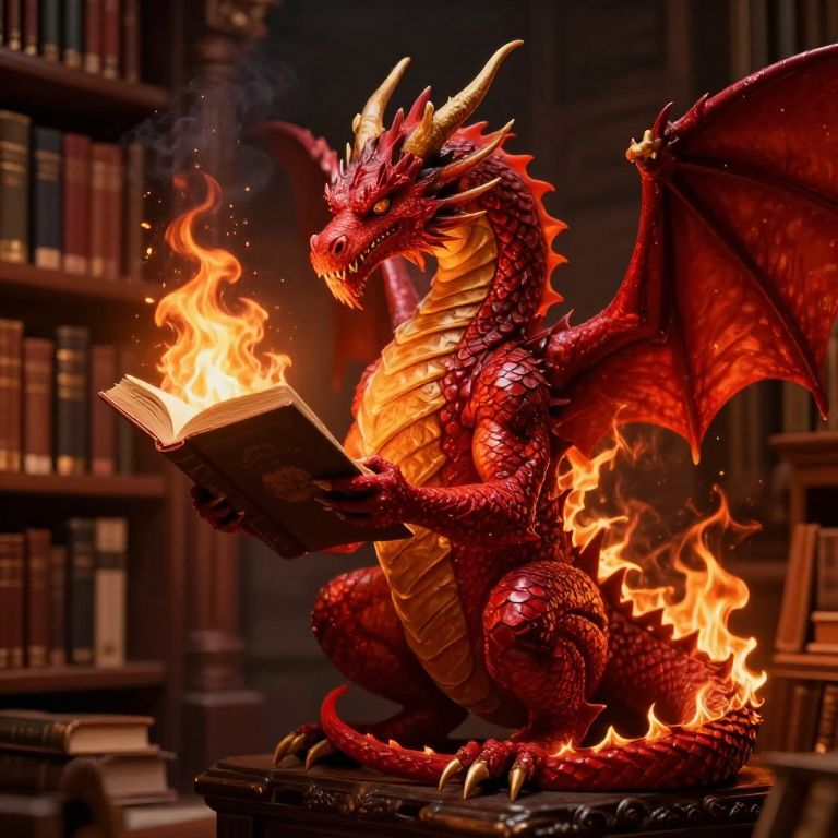 A fiery red dragon, perched serenely in a library, holds an open book while its tail emits flames that dance like living embers, defying the mundane boundaries between fire and knowledge.
