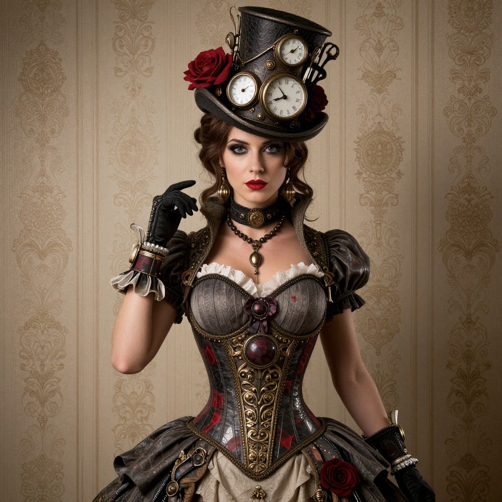 A steampunk-inspired digital artwork featuring a woman adorned in intricate Victorian-style attire, including a corseted dress, a top hat embellished with clocks and roses, and accessories like a choker necklace and wrist cuffs, all rendered in high-definition detail against a vintage wallpaper backdrop.