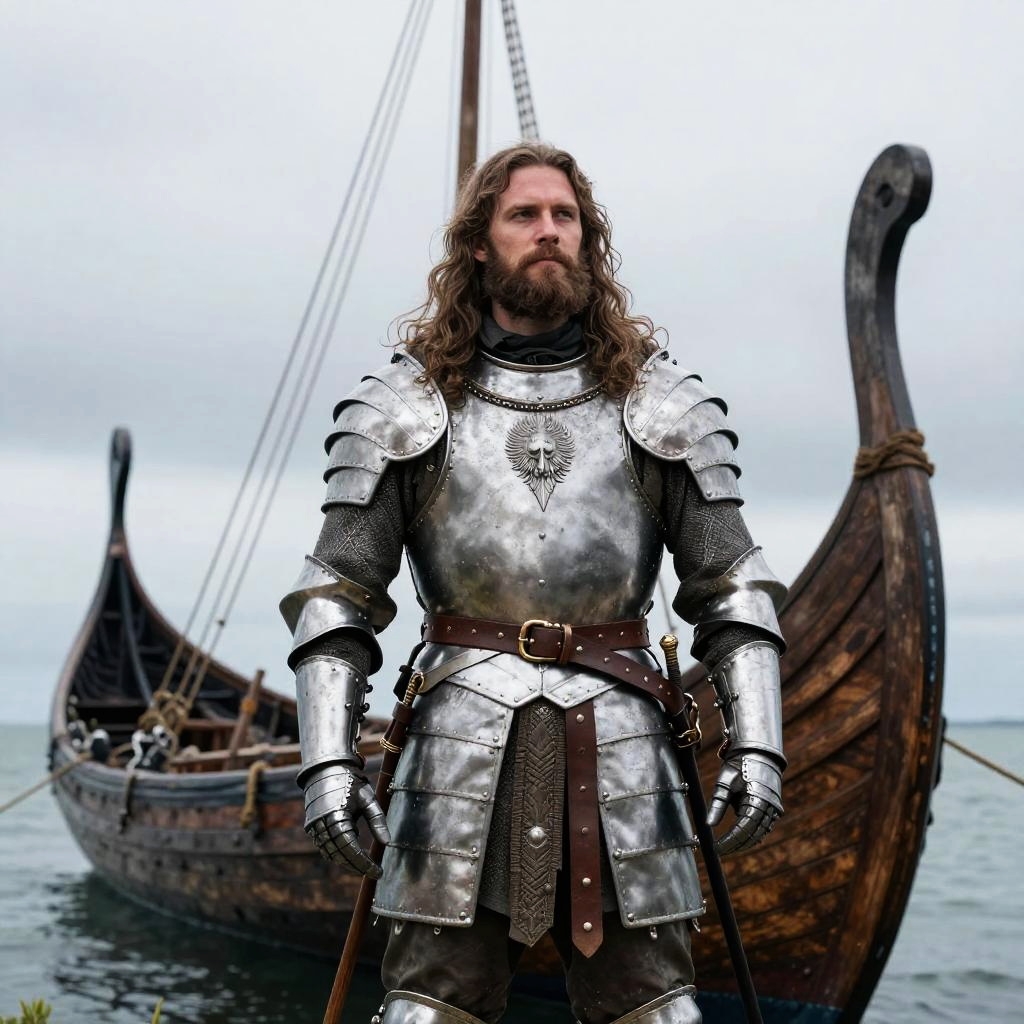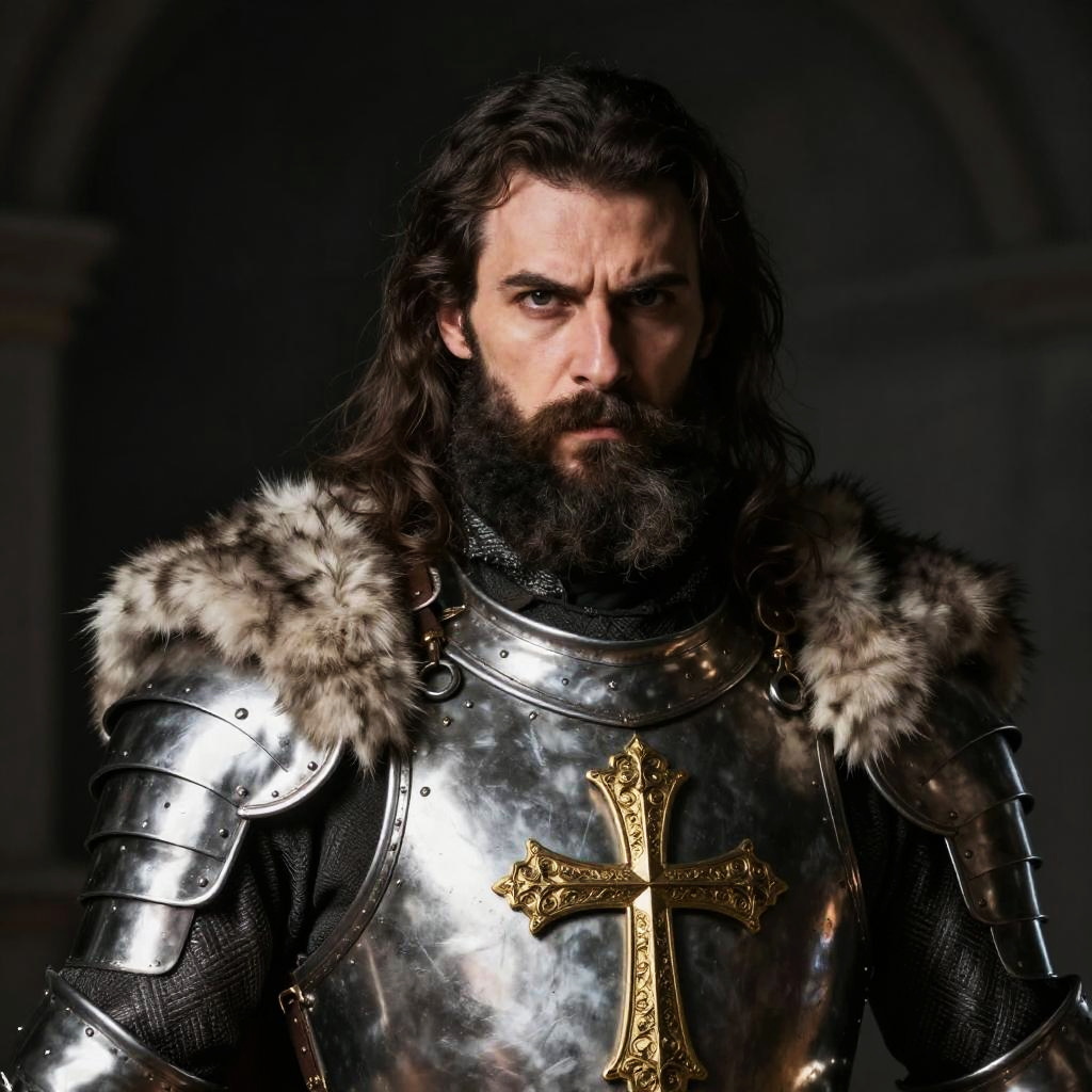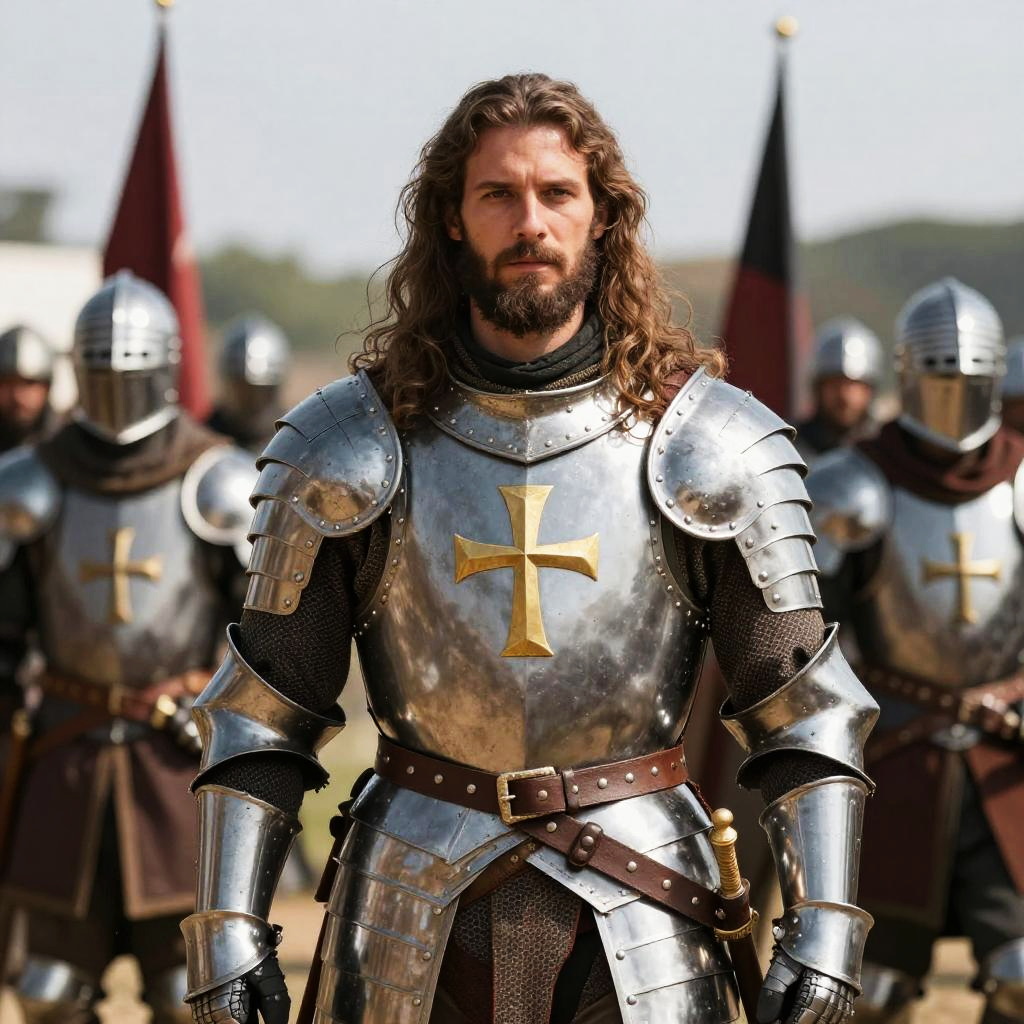 Photograph of a bearded, long-haired man in medieval silver armor with a gold cross, standing in front of a group of similarly armored soldiers with