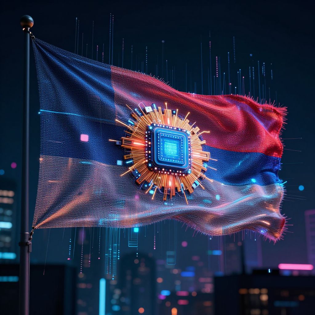 Flag AI artwork, an intricate flag composed of glowing microchips and woven fiber optics, fluttering in a digital breeze, surrounded by holographic data streams and a dark futuristic cityscape, neon highlights and a cybernetic atmosphere, highly detailed textures
