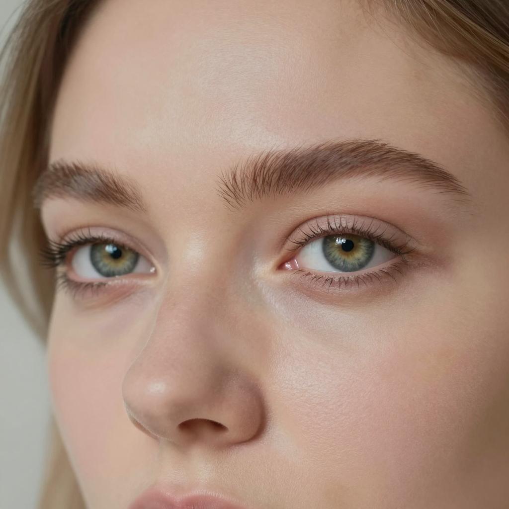 A woman's face with green eyes, slightly open mouth with pink lips, and blonde hair. Dark shadow on the right side of her face. Background is blue.