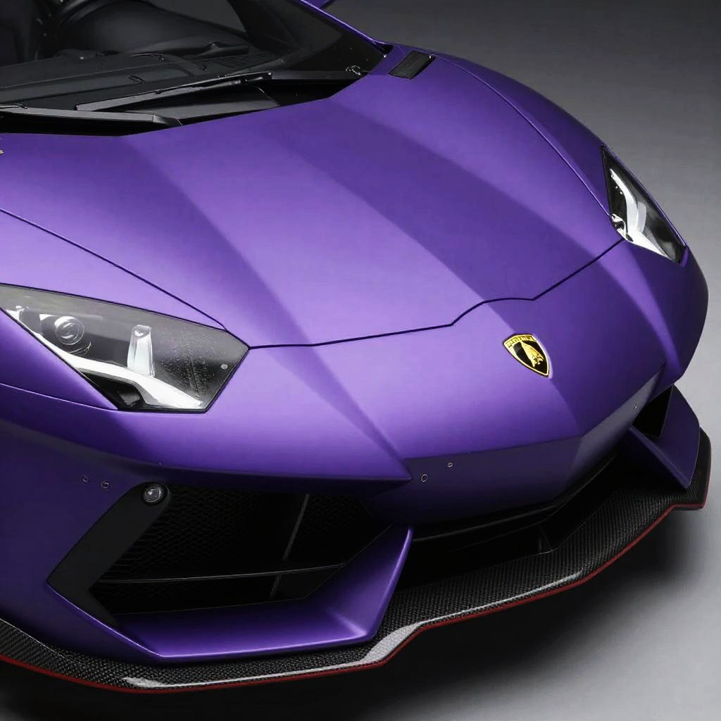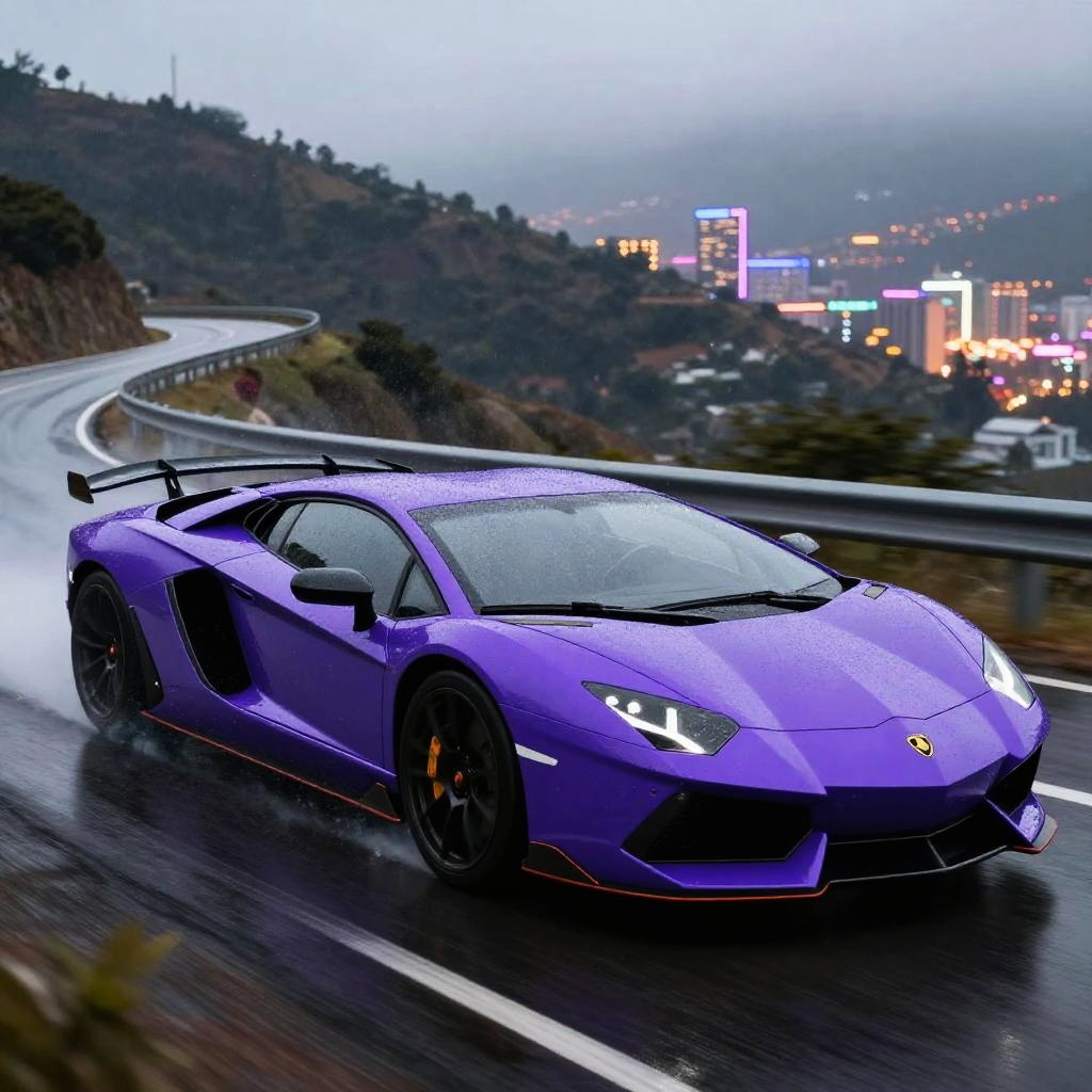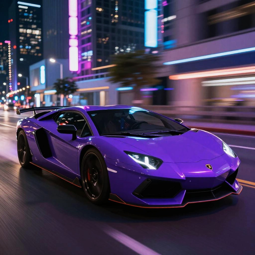 Matte purple Lamborghini speeding through a futuristic neon-lit cityscape at night, reflections glowing on the sleek surface, dynamic motion blur, cyberpunk aesthetic, ultra-detailed, high contrast lighting, sharp edges, photorealistic style.