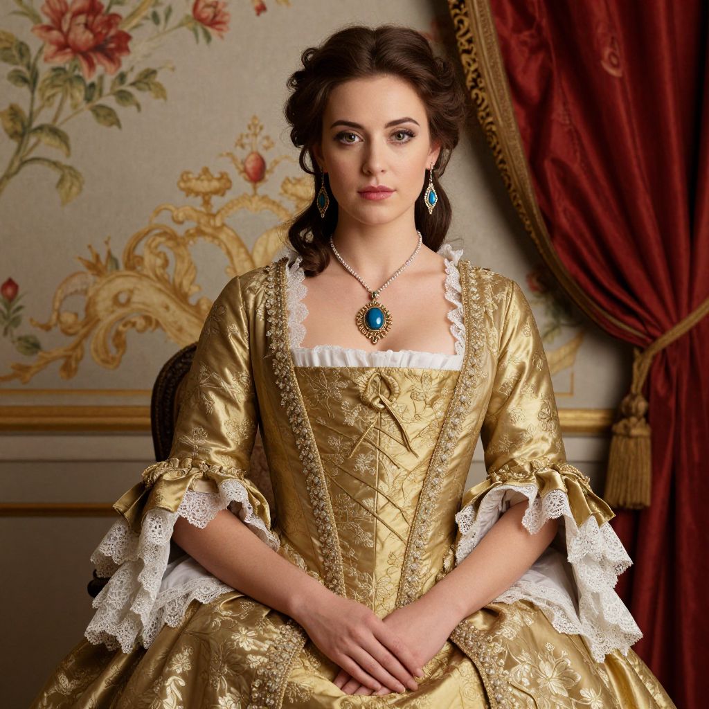 Elegant woman wearing a regal 18th-century gown with gold corset detailing and intricate lace trim, accessorized with a pendant necklace and dangling earrings, seated gracefully against a backdrop of floral wallpaper and a red curtain with golden accents.
